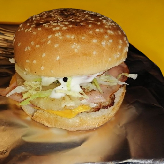 En pan grande; Carne %100 de res con queso amarillo rebanado, piña y jamón, lechuga, jitomate, cebolla, chile jalapeño, cátsup, crema, chimichurri y mostaza.