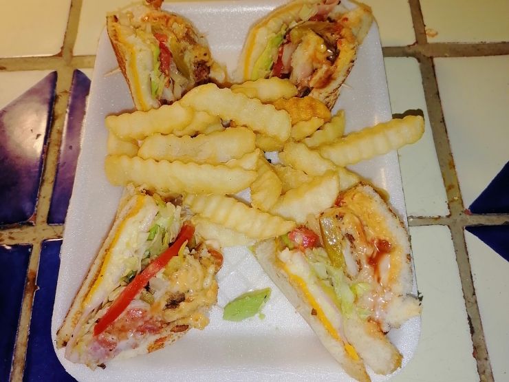 Pan blanco, jamón, queso blanco y amarillo, milanesa de cerdo empanizada y verdura (lechuga,jitomate, cebolla y chile), catsup, crema y chimichurri.