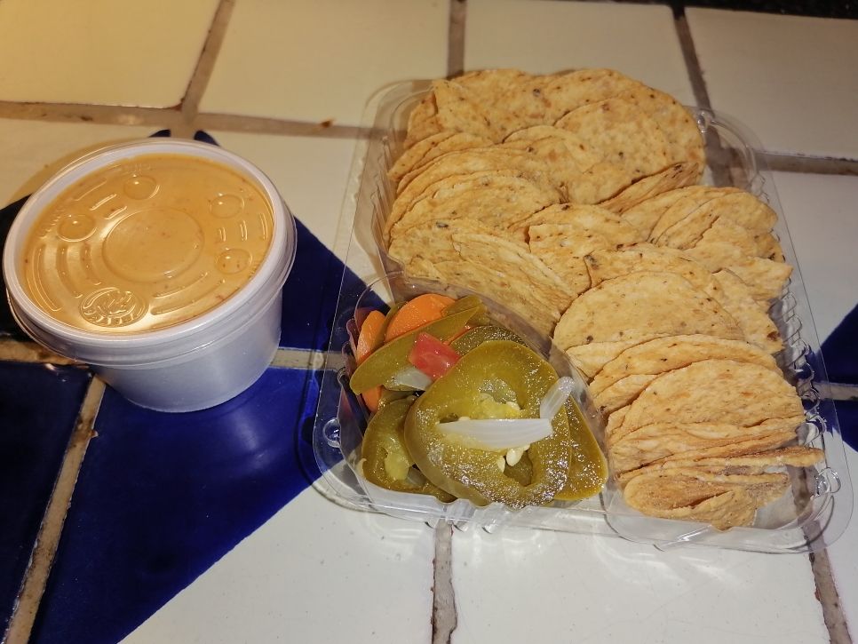 Nachos en charola normal con queso y chile jalapeño. Todo en compartimentos para que no se remojen.