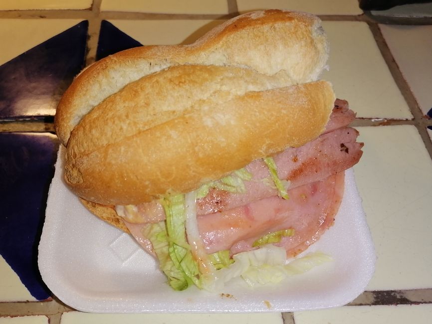 Doble jamón con queso blanco asadero y queso amarillo rebanado, y una salchicha en bolillo especial de la casa, lechuga, jitomate, cebolla, chile jalapeño, cátsup, crema y chimichurri.