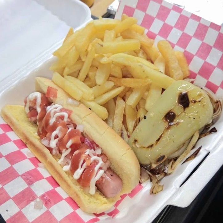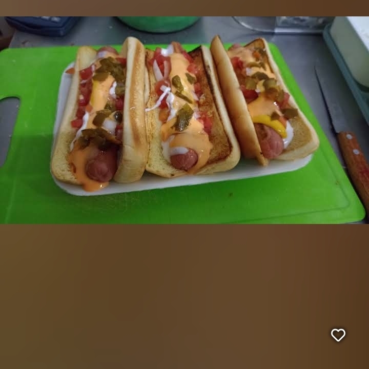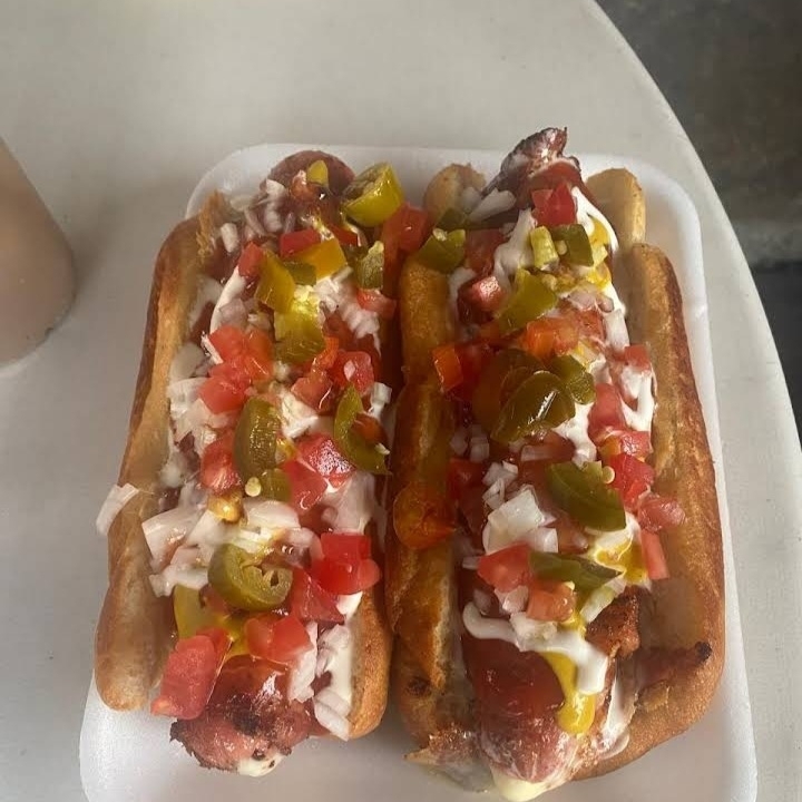 Salchicha, jitomate,cebolla,chile jalapeños ,aderezos