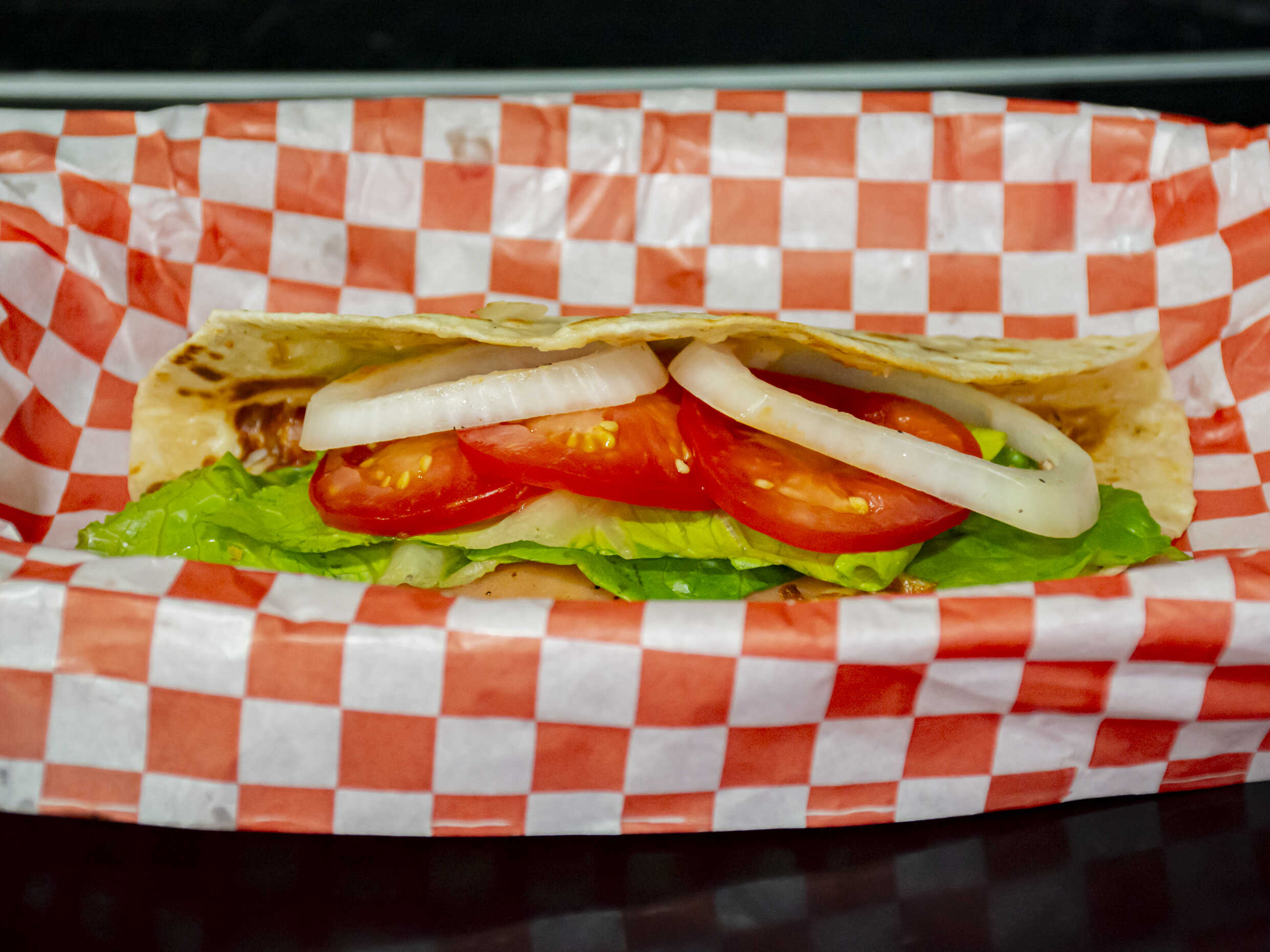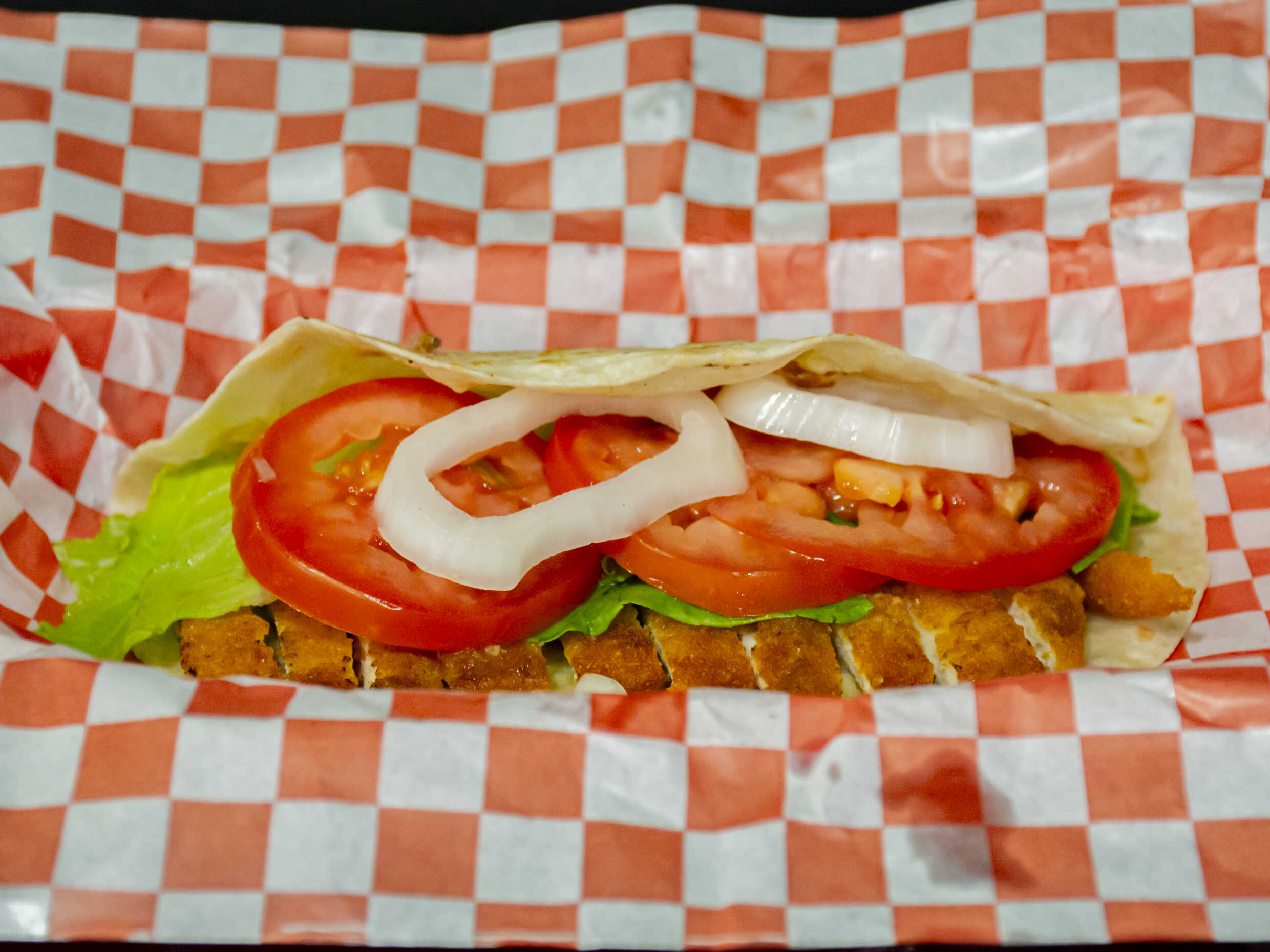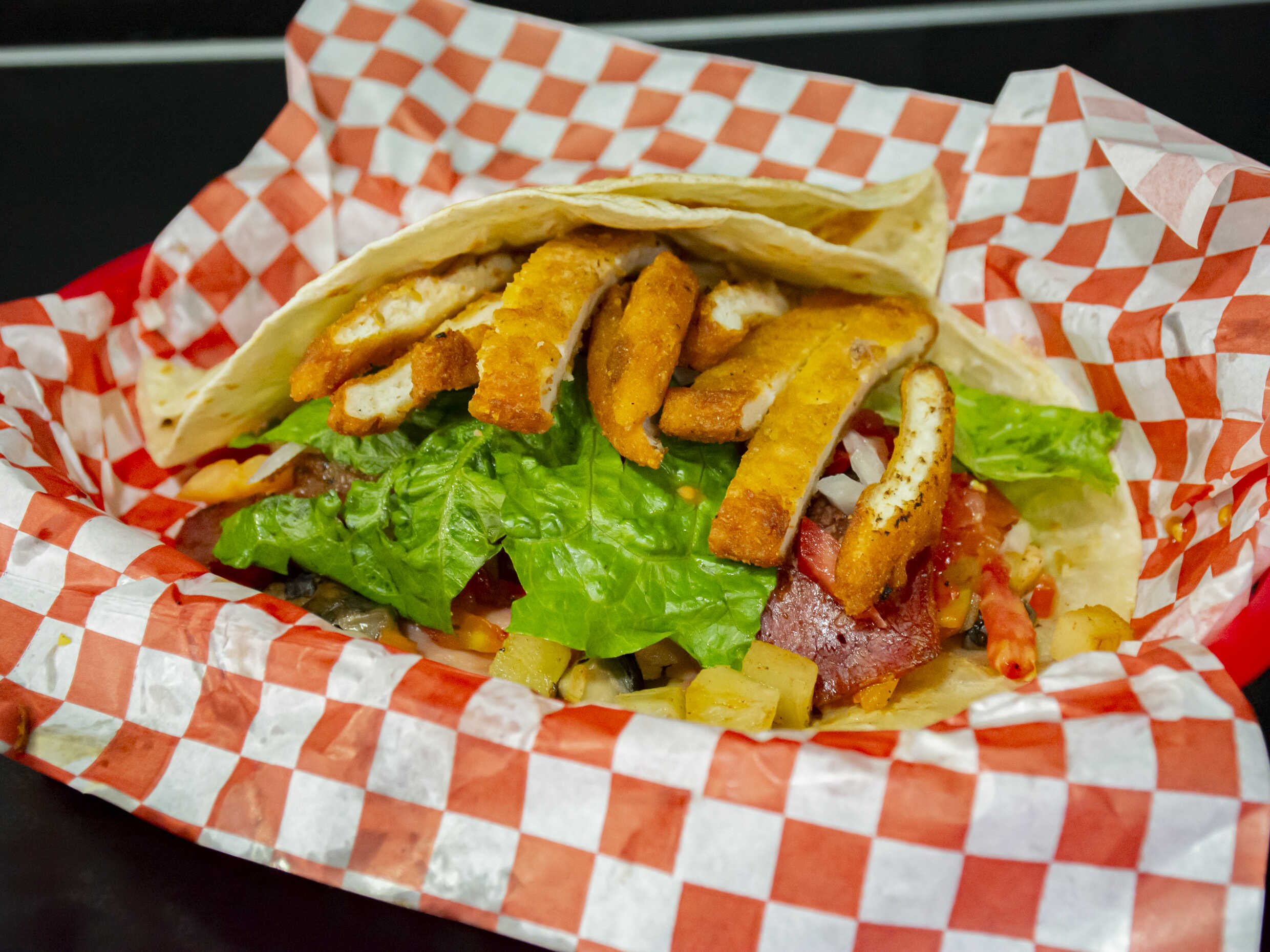 Elaborado con tortilla de harina, pollo empanizado, queso blanco y vegetales de productores de la región.