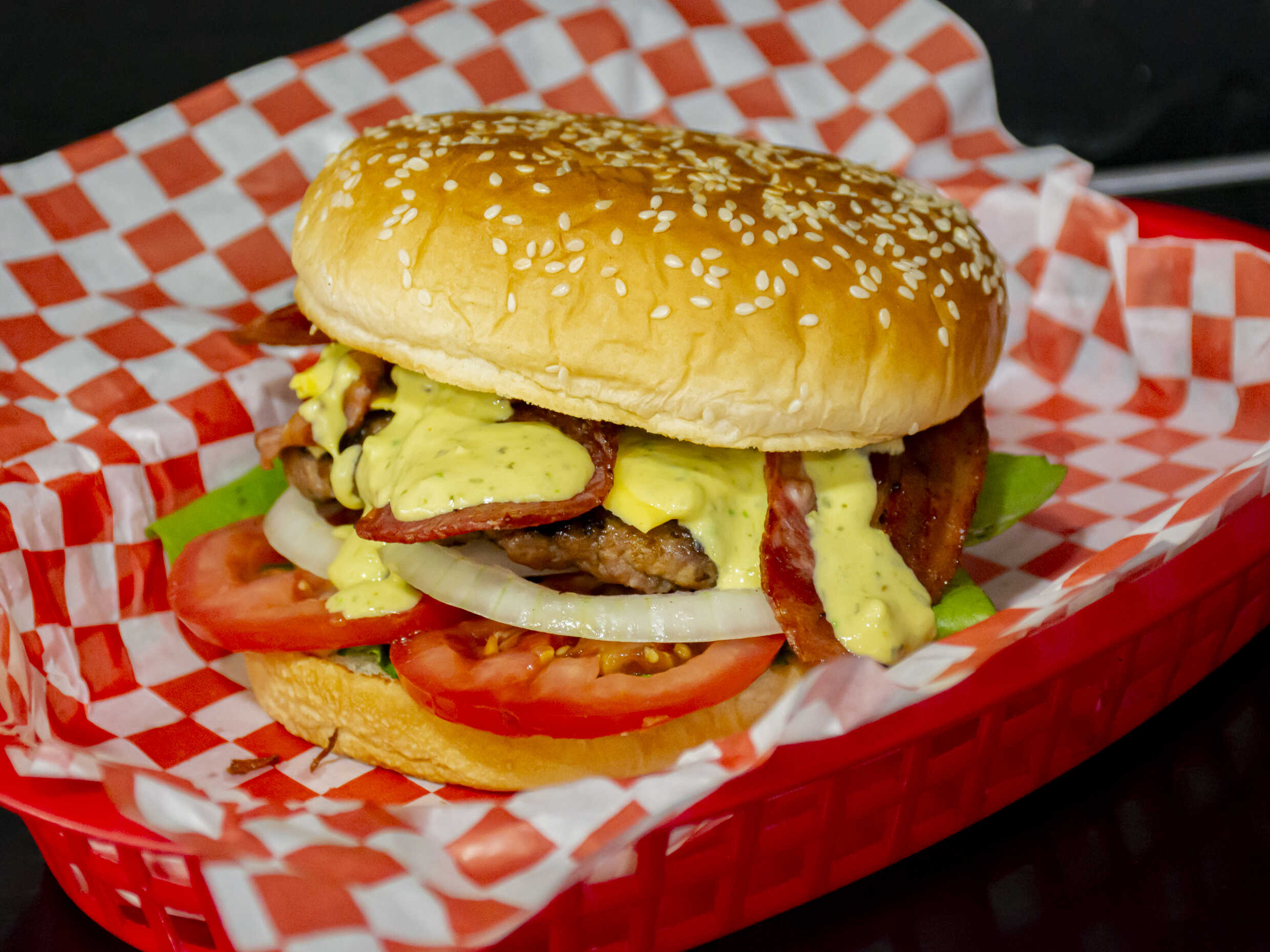 Doble carne de res 100%, queso americano, doble tocino de calidad premium, guacamole y vegetales de productores locales.