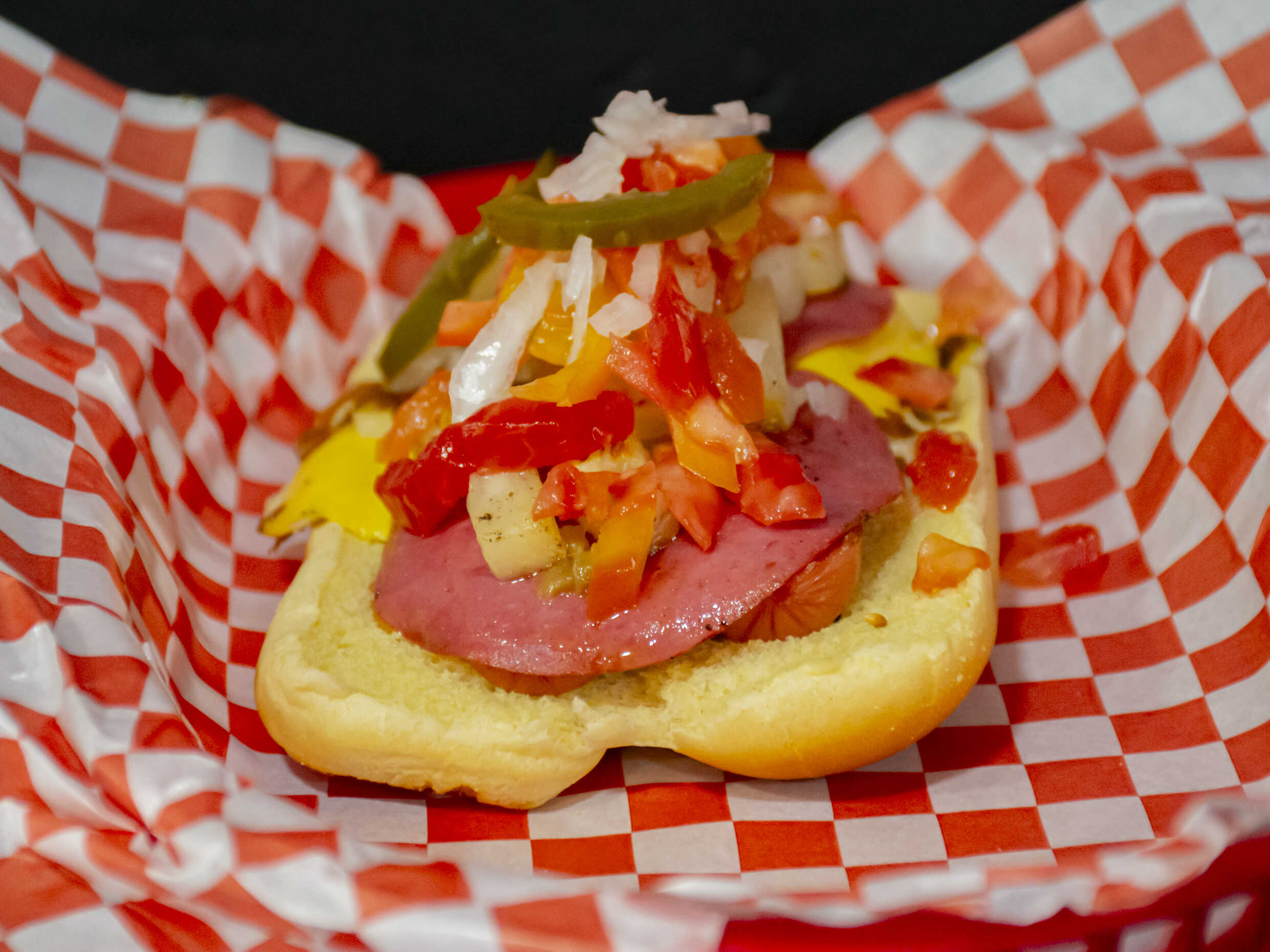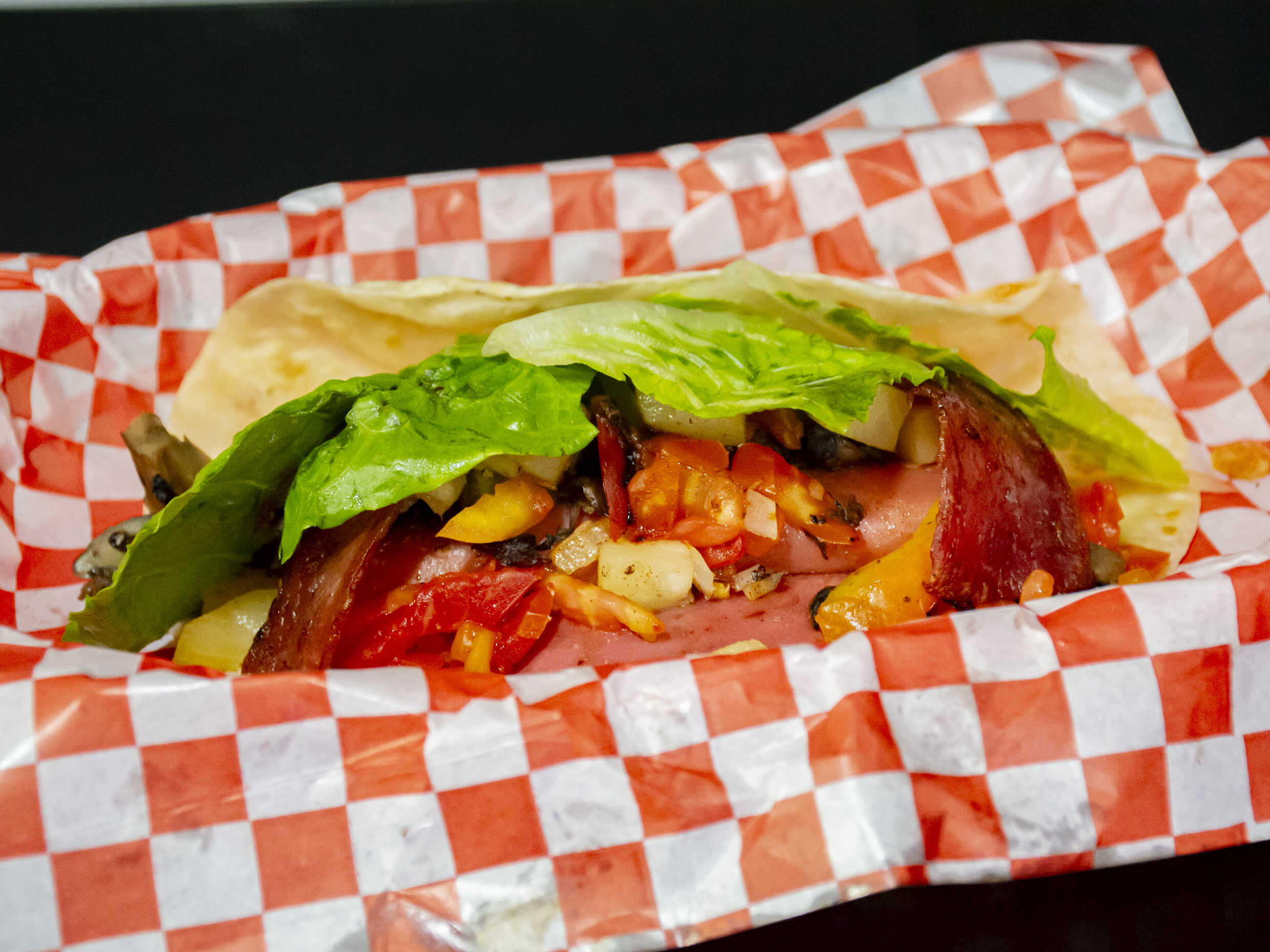 Preparado con salchicha de pavo, tocino, queso amarillo y blanco y vegetales de productores regionales.