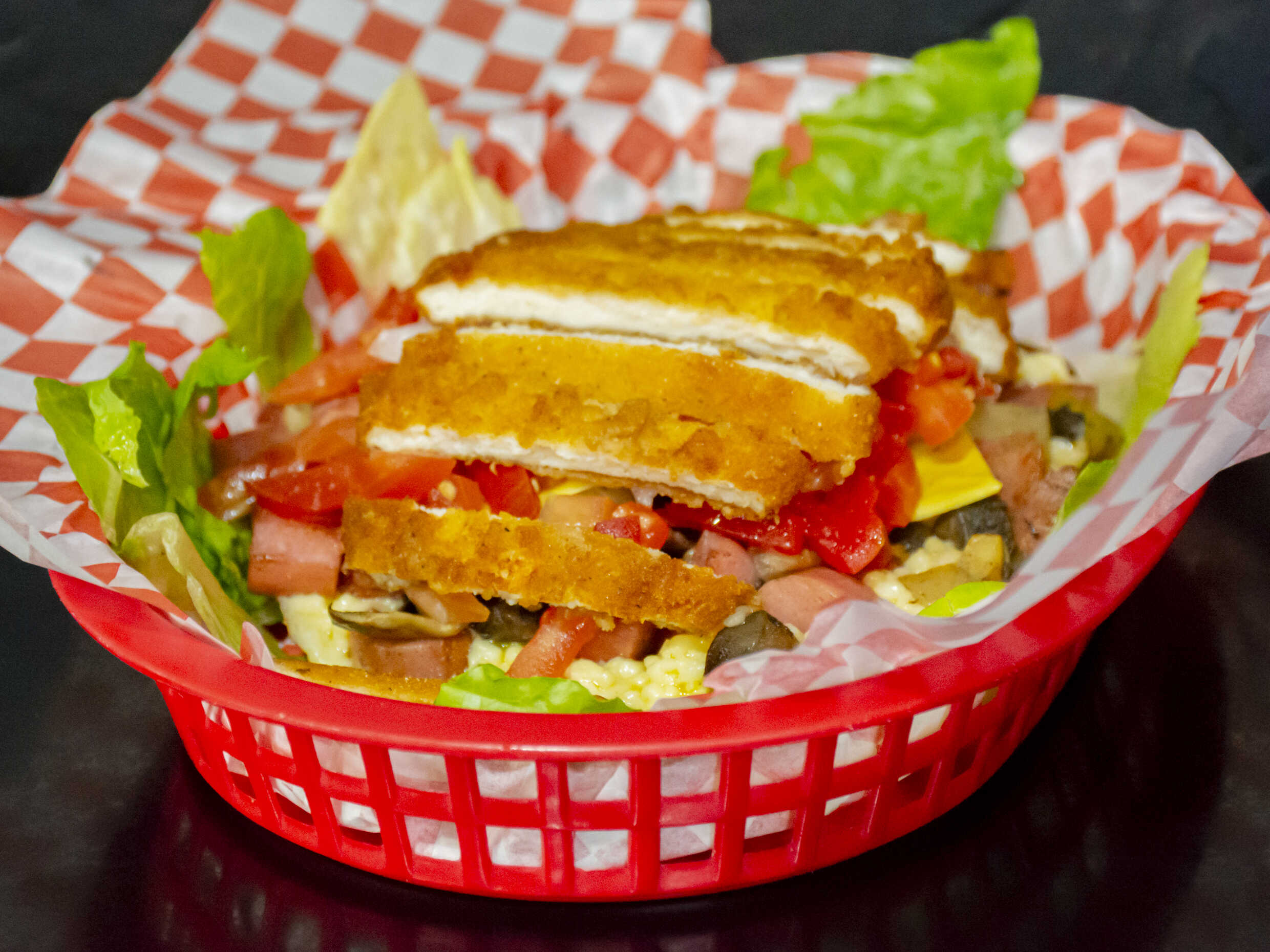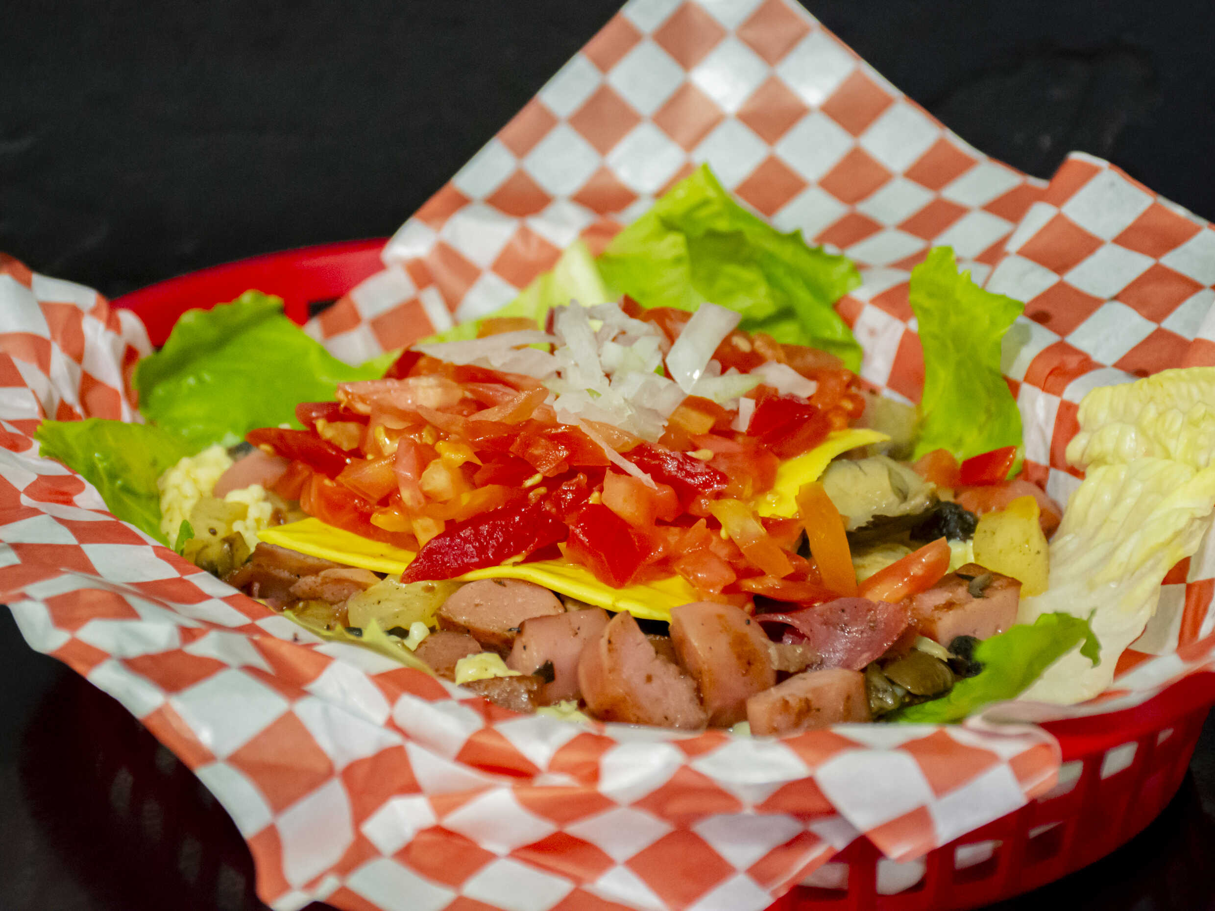 Cama de lechuga, verduras de la mas alta calidad de productores regionales, acompañada de piña, queso blanco y el tradicional queso americano, salchicha de pavo de la mas alta calidad, tocino, salami, jamón, arrachera o milanesa de pollo.