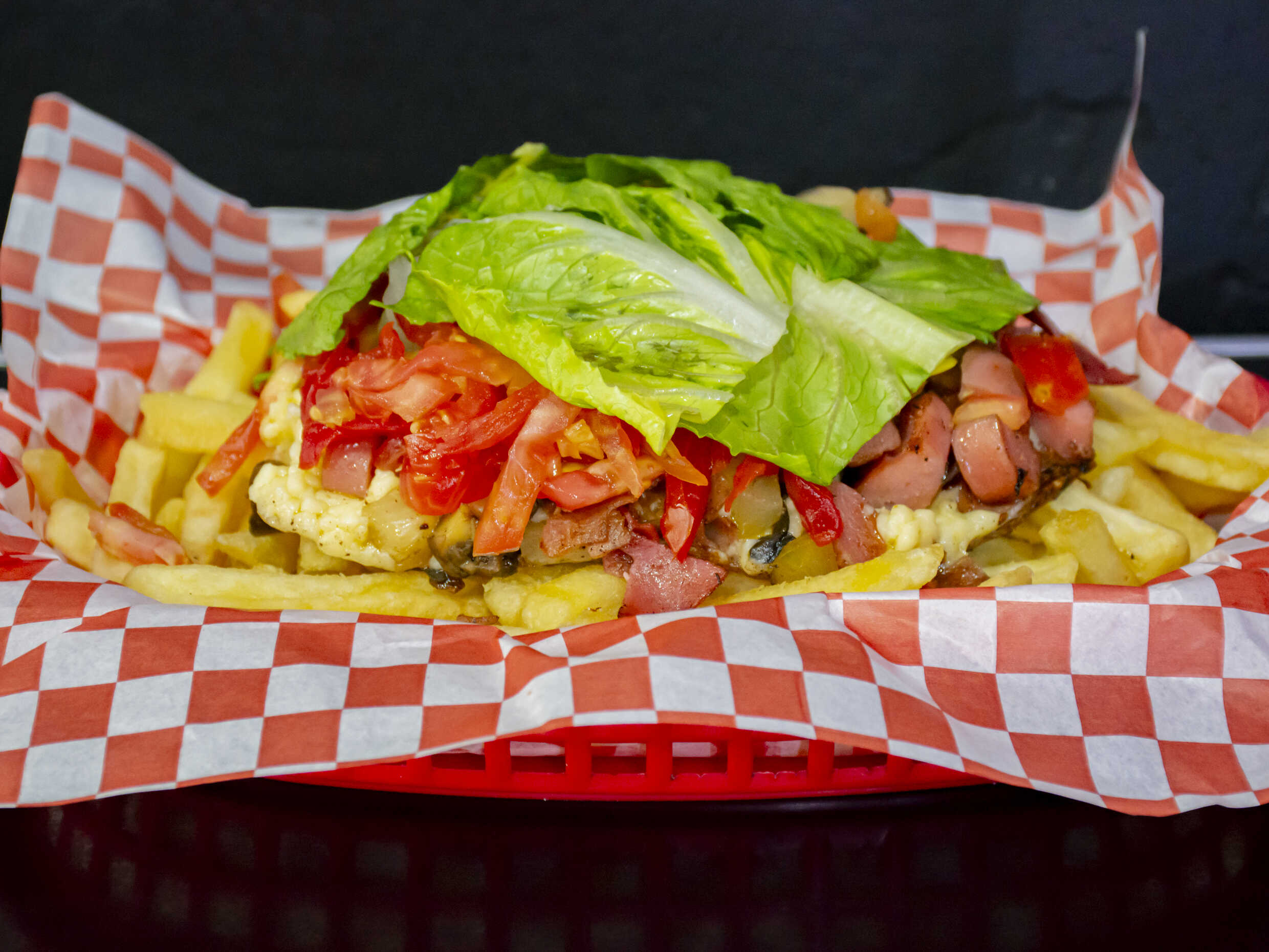 Hechas con papa 100% natural frita al momento, champiñones, piña, queso blanco, queso amarillo fundido, salchichas, tocino, jamón y salami de la mas alta calidad y preparada con mayonesa, mostaza, cátsup y la chimichurri de la casa.