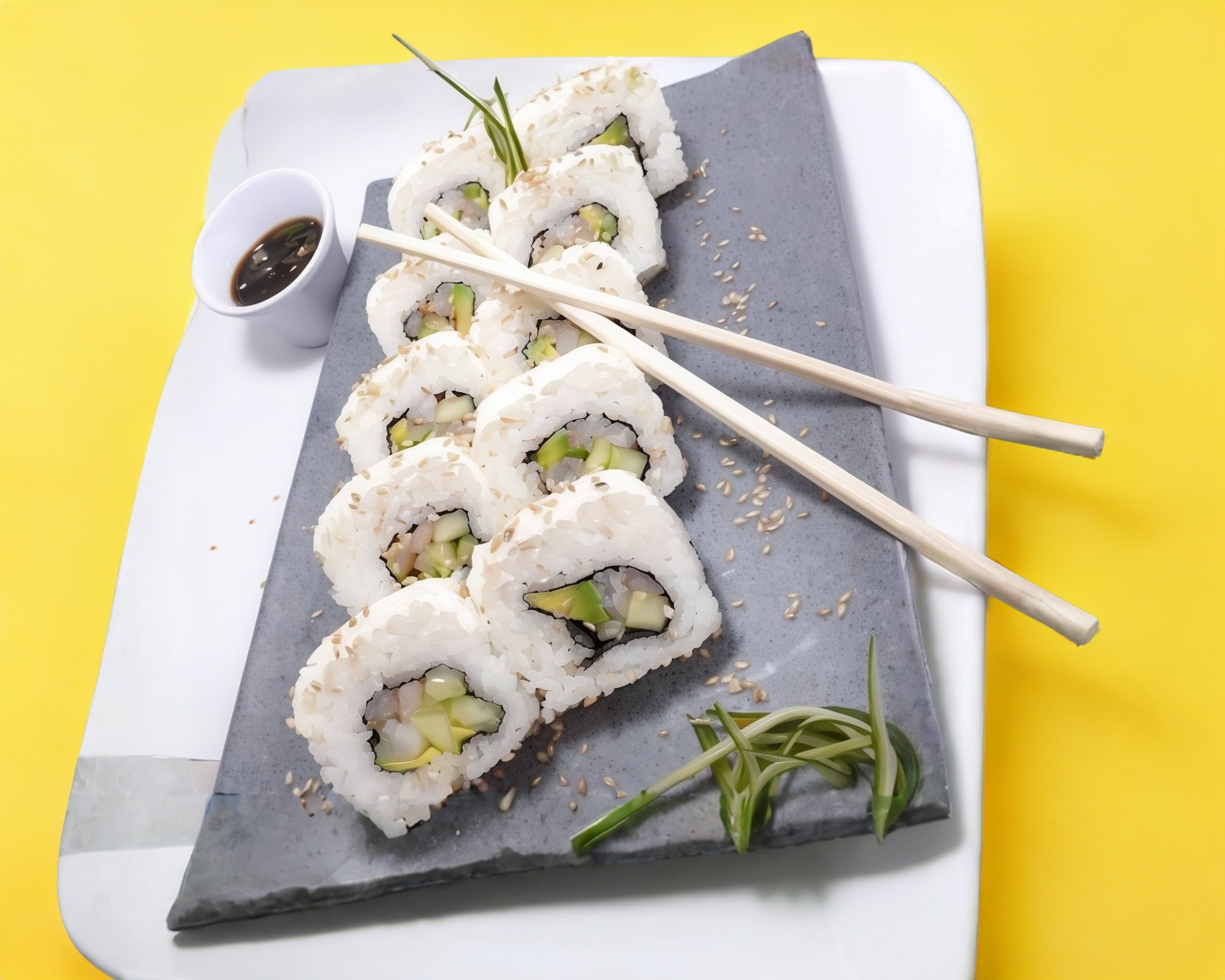 Envuelto en arroz y queso crema, relleno de aguacate y pepino.