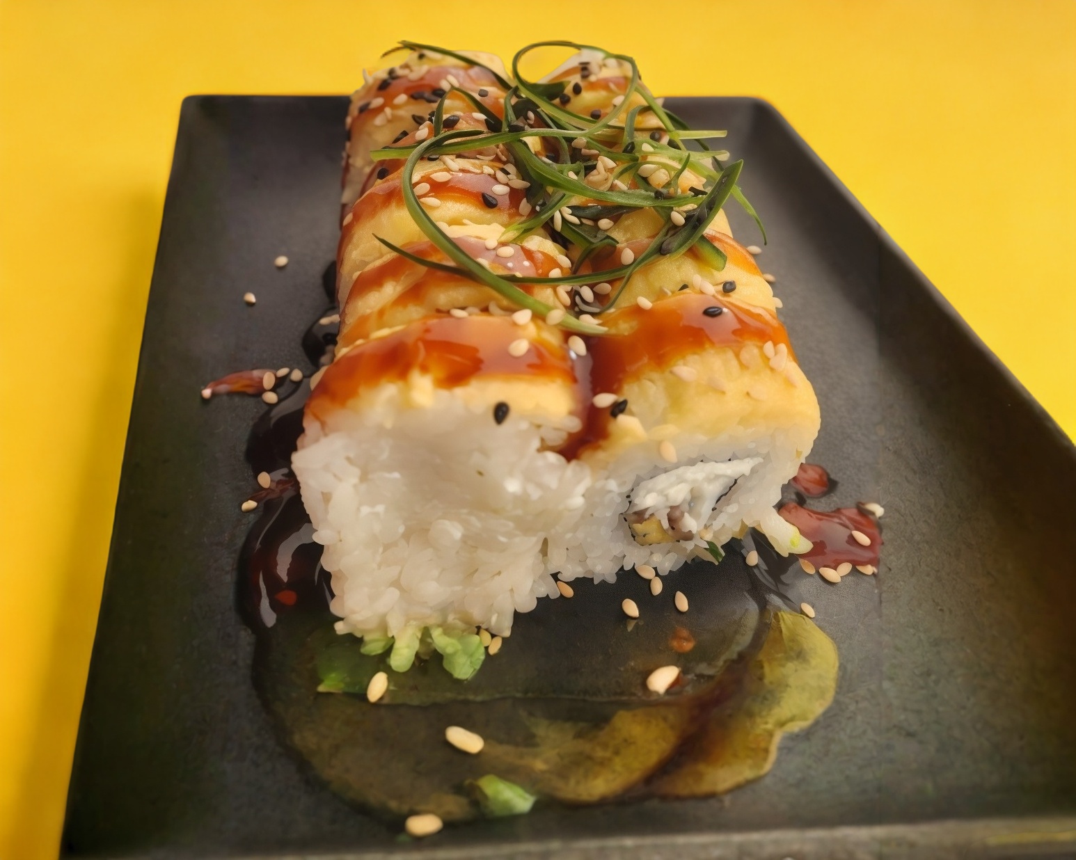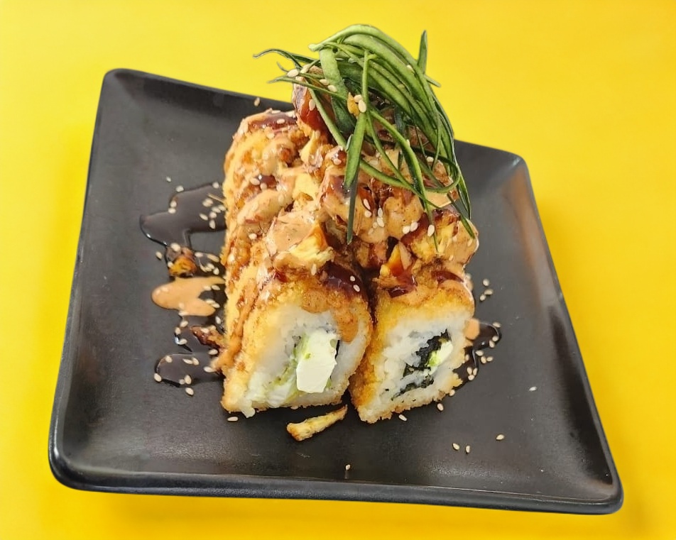 Rollo empanizado, relleno de aguacate, queso, pepino, acompañado de pollo agridulce por encima.