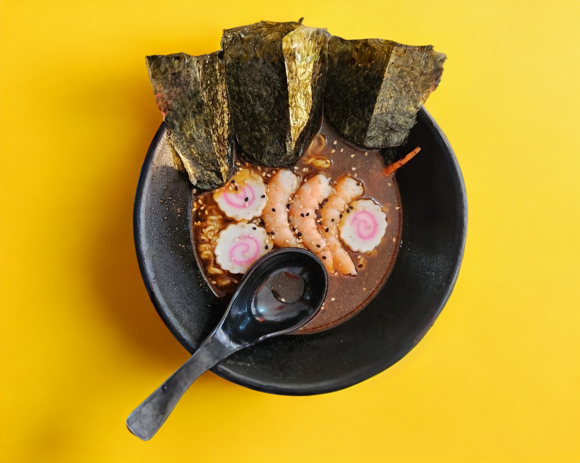 Acompañado de verduras, res, alga, soya, naruto y camarón.
