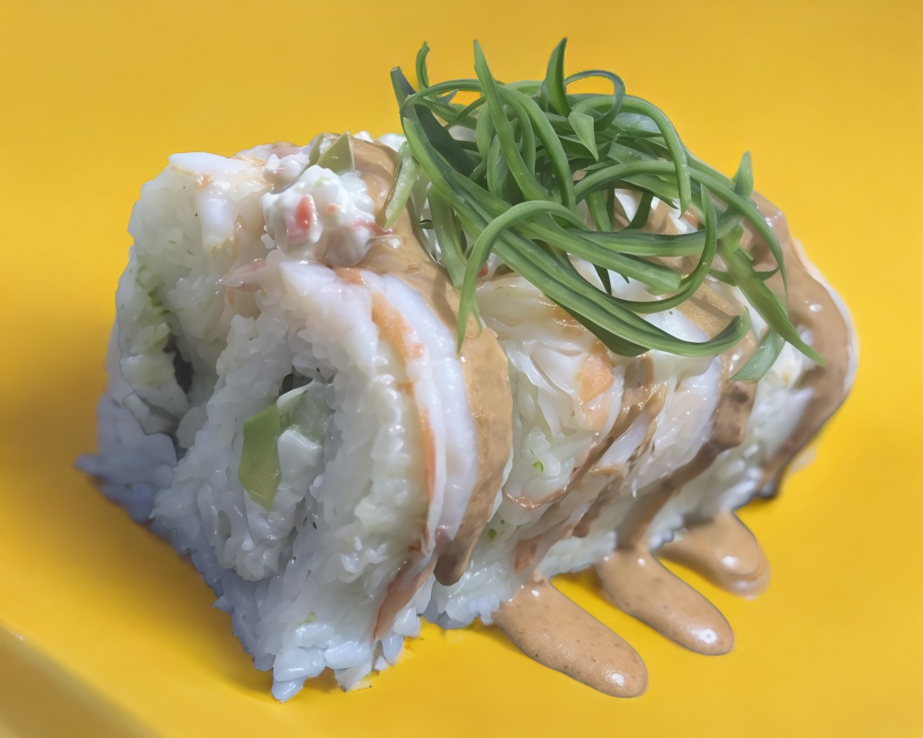 Envuelto en alga, relleno de arroz, pepino, aguacate, queso crema, camarón, cangrejo y salmón.