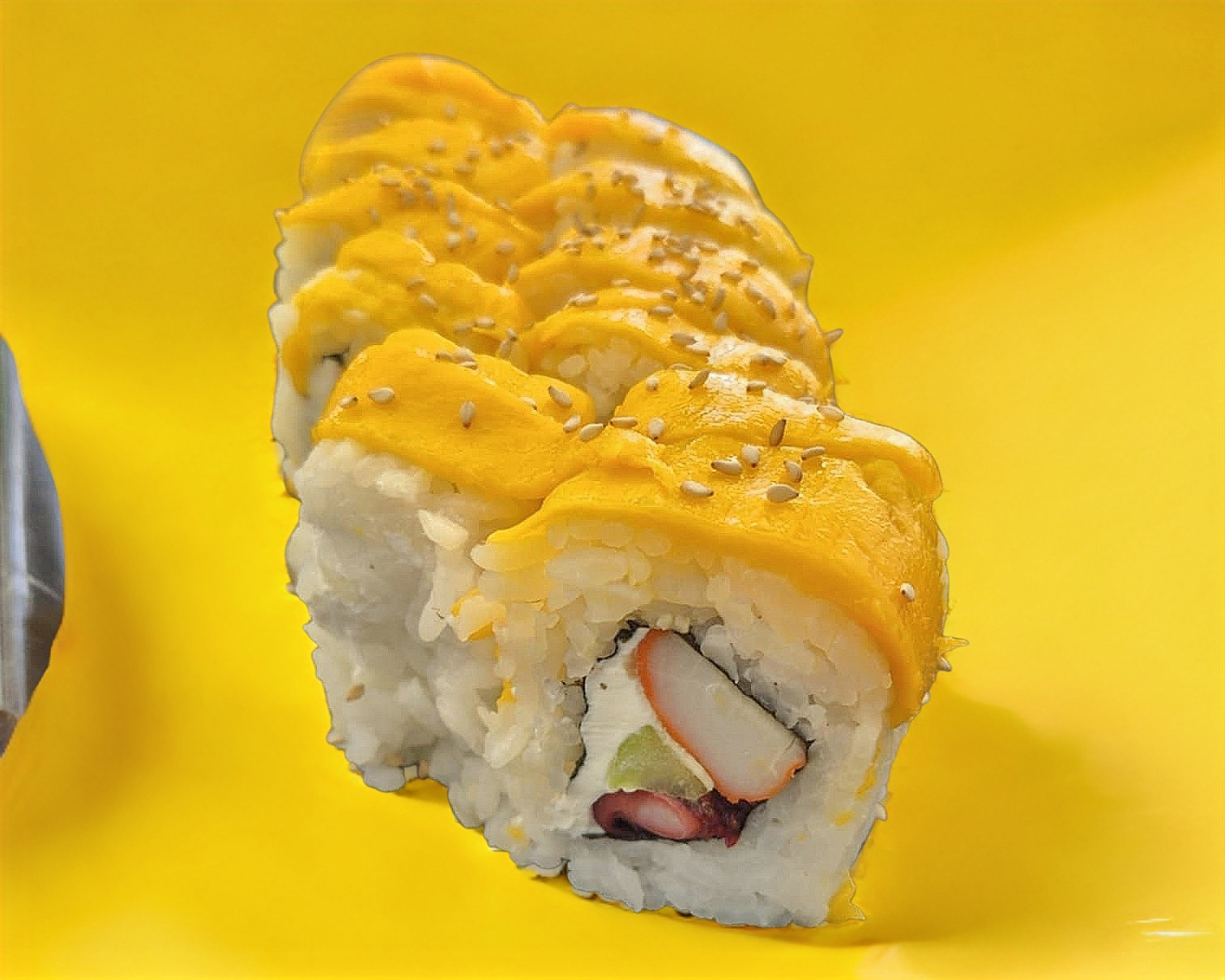 Envuelto en arroz y mango relleno de pepino y queso crema.