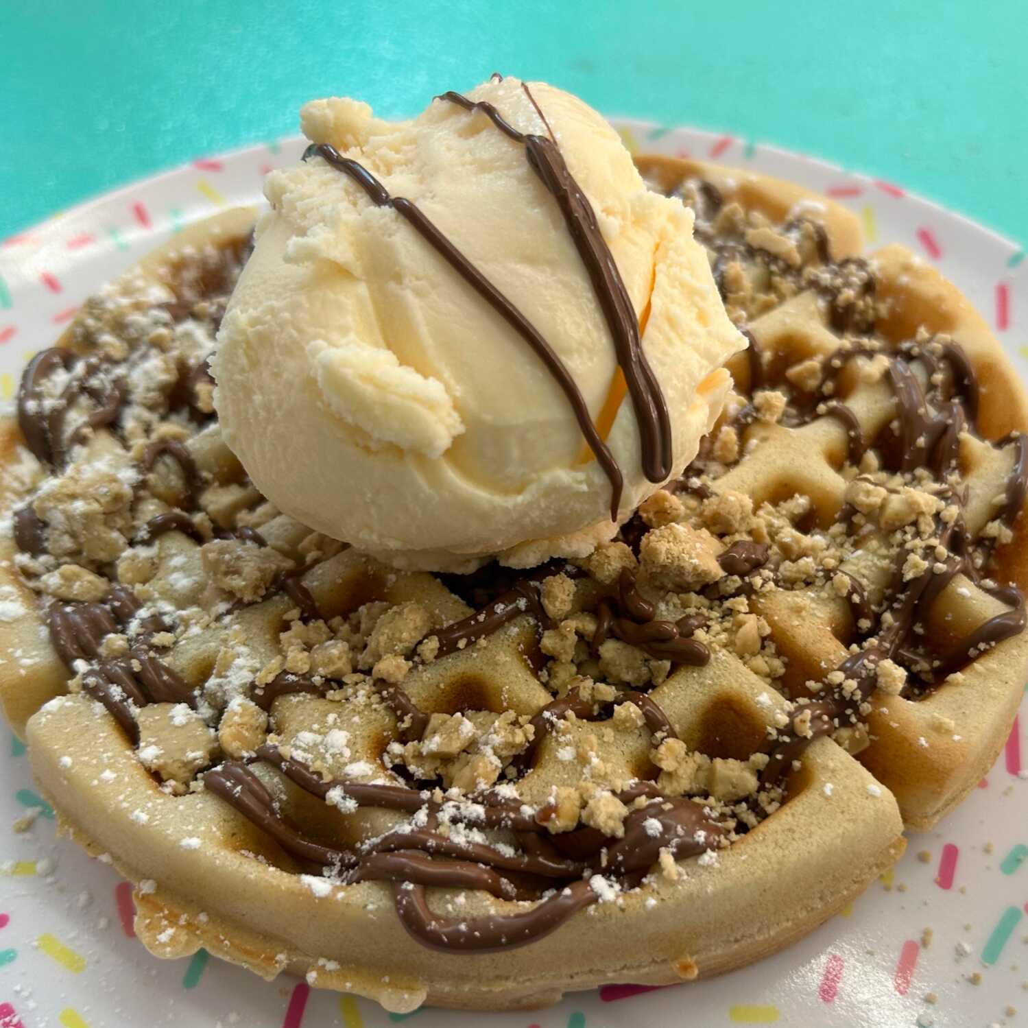 Waffle 20 cm de 3 ingredientes: 1 bola de helado, 1 base y 1 topping.