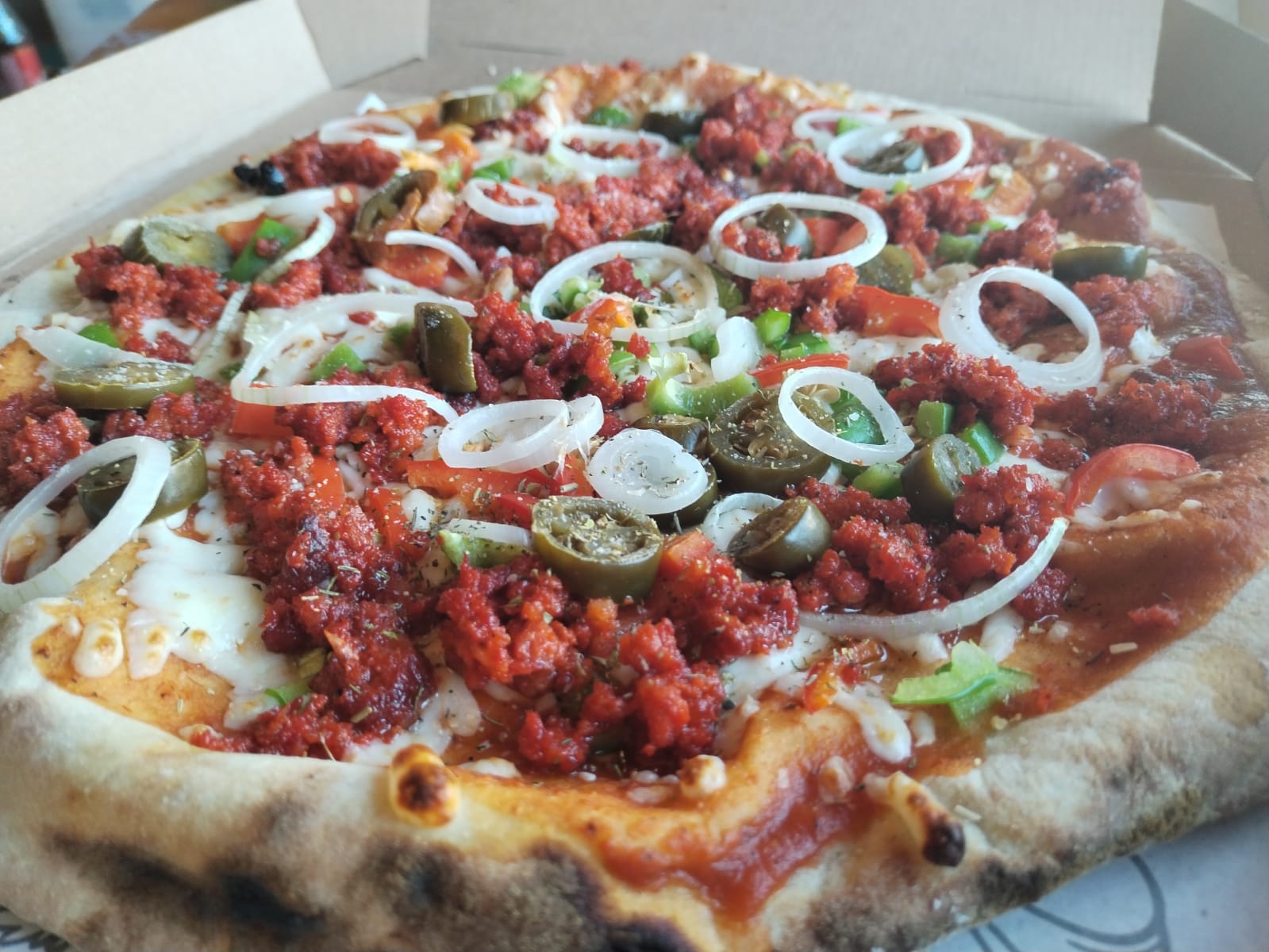 Pizza a la leña de de 35 CM. Chorizo especial, pimiento, cebolla, jalapeños.