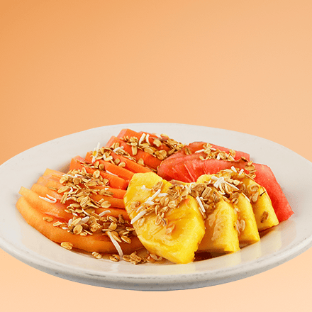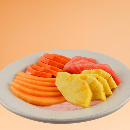 (4 frutos a escoger). Papaya, sandia, melón, plátano, piña, fresa, kiwi y manzana. Acompañado con granola y yogur natural o fresa.