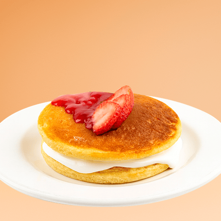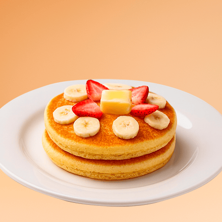 Dos hot cakes esponjosos preparados con nuestra deliciosa receta de la casa, acompañado con plátano y fresa bañados en chocolate o mermelada, o miel maple.