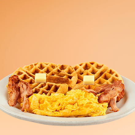 Dos waffles recién hecho, acompañado con dos huevos revueltos y tocino en tiras, mantequilla y miel maple