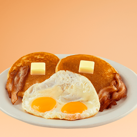 Dos hot cakes recién hechos, acompañados con dos huevos estrellados y tocino en tiras, mantequilla y miel maple.