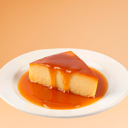 Rebanada de Flan napolitano cremoso con suave sabor a vainilla y toque de caramelo.
