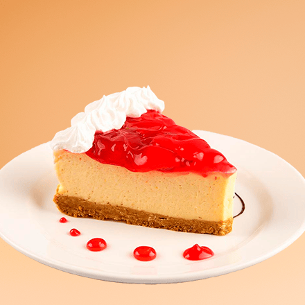 Rebanada de Pay de queso cremoso con base de galleta y glase de fresa.