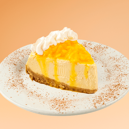 Rebanada de Cheesecake cremoso con base de galleta y suave glase de durazno.