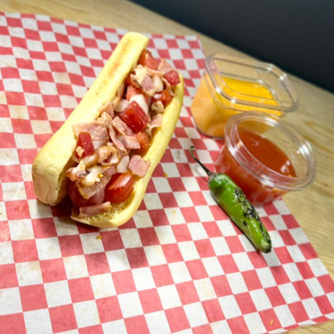 Pan, salchicha, tocino y aderezos.