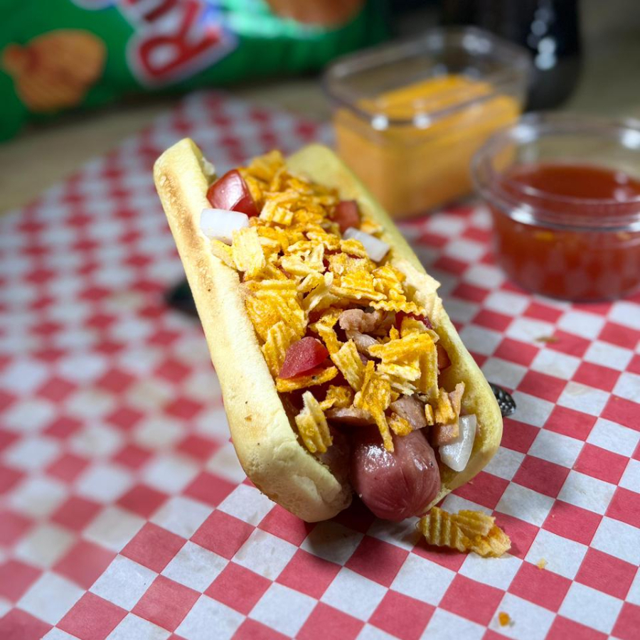 Pan, salchicha, tocino, aderezos, cebolla con pimiento y Rufles o Flamit hot.