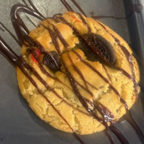 Deliciosa galleta de vainilla rellena de chocolate con chispas de chocolate y chocolate por encima.