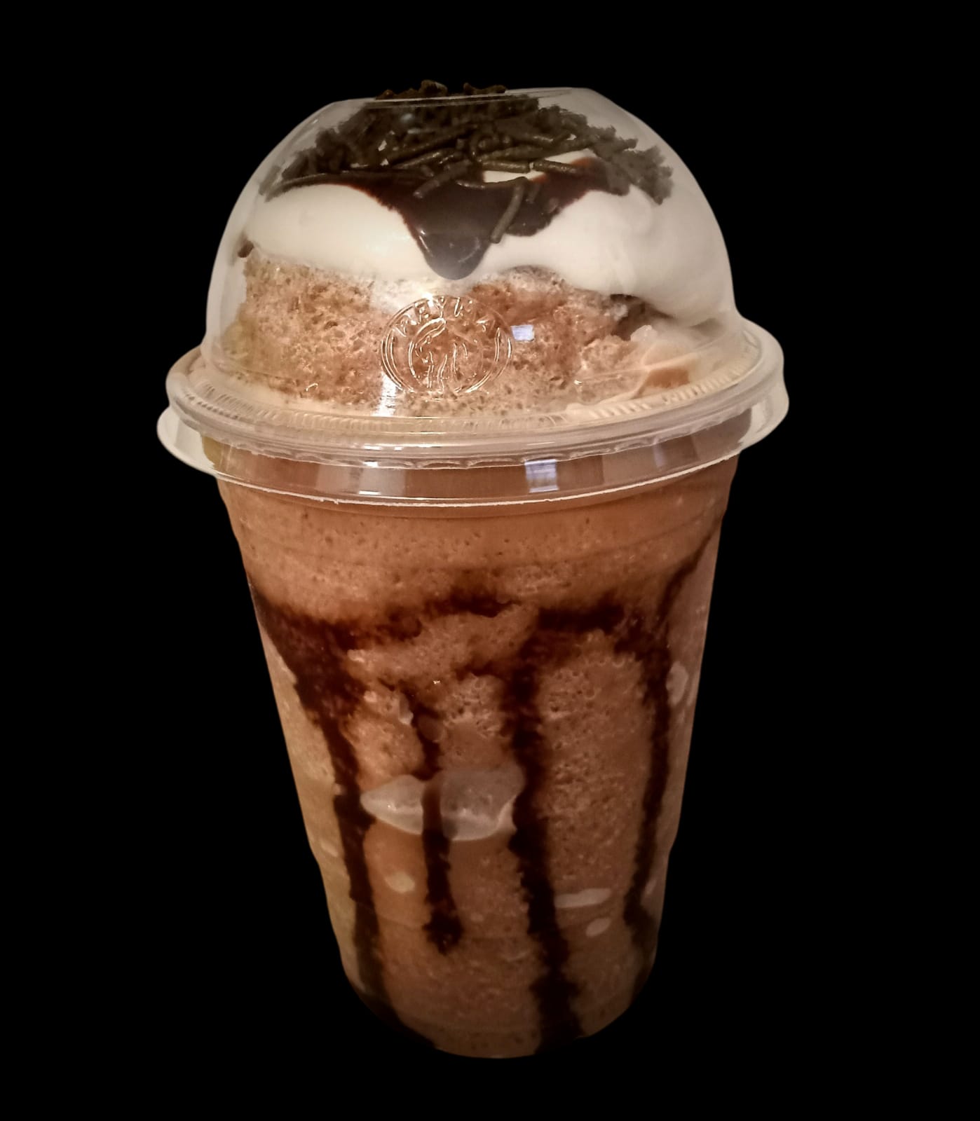 Delicioso frappé de café con chocolate a base de leche, con crema batida y topping de tu preferencia