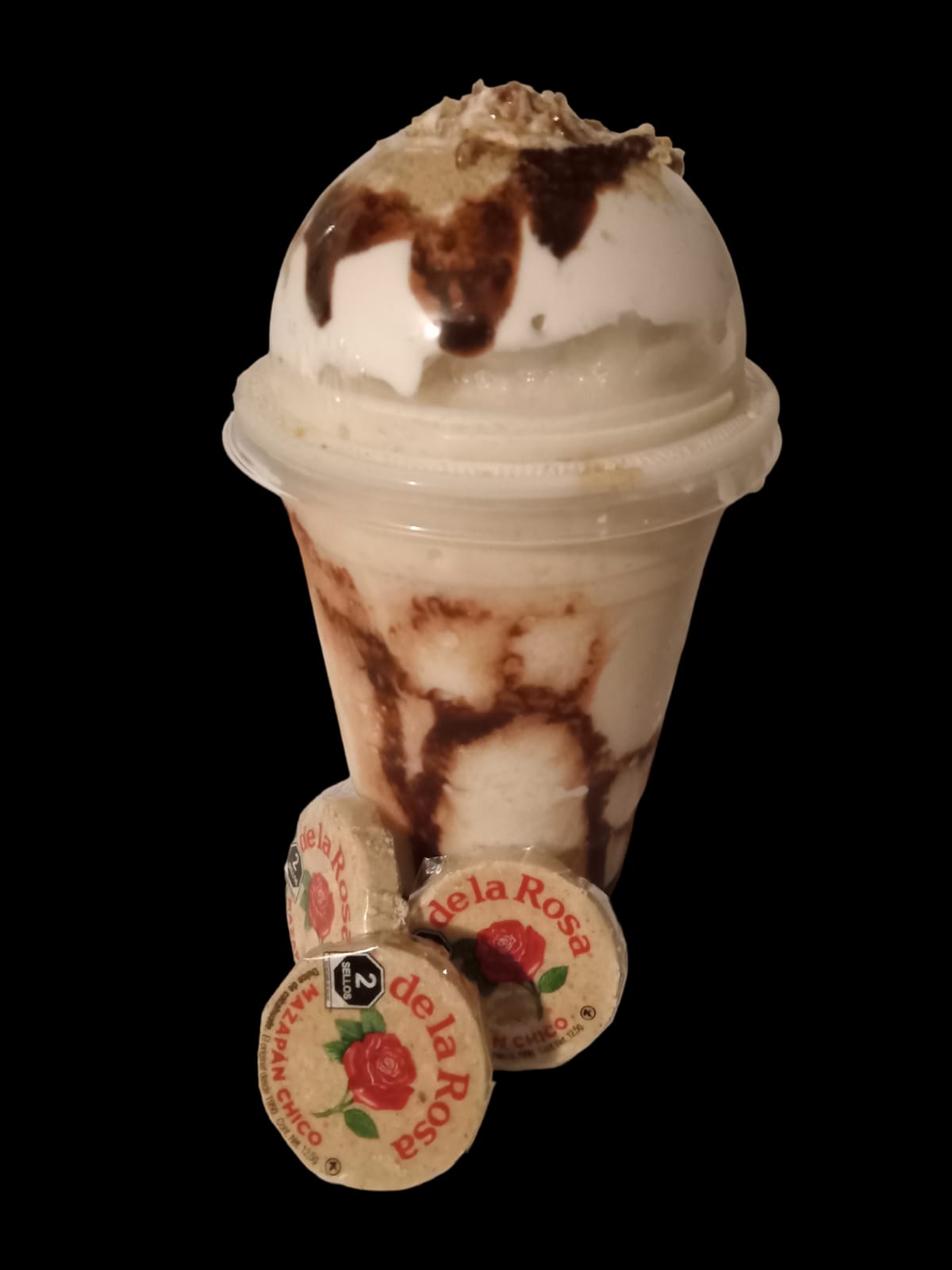Delicioso frappé de mazapán a base de leche, con crema batida y topping de tu preferencia.