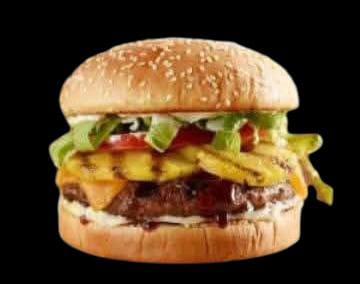 deliciosa hamburguesa elaborada con carne de res, piña, jamón, queso blanco y amarillo.