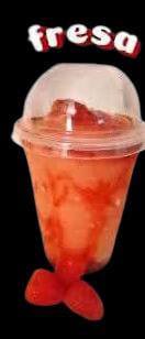 Delicioso frappé de fresa natural a base de agua, acompañado de chamoy liquido y en polvo