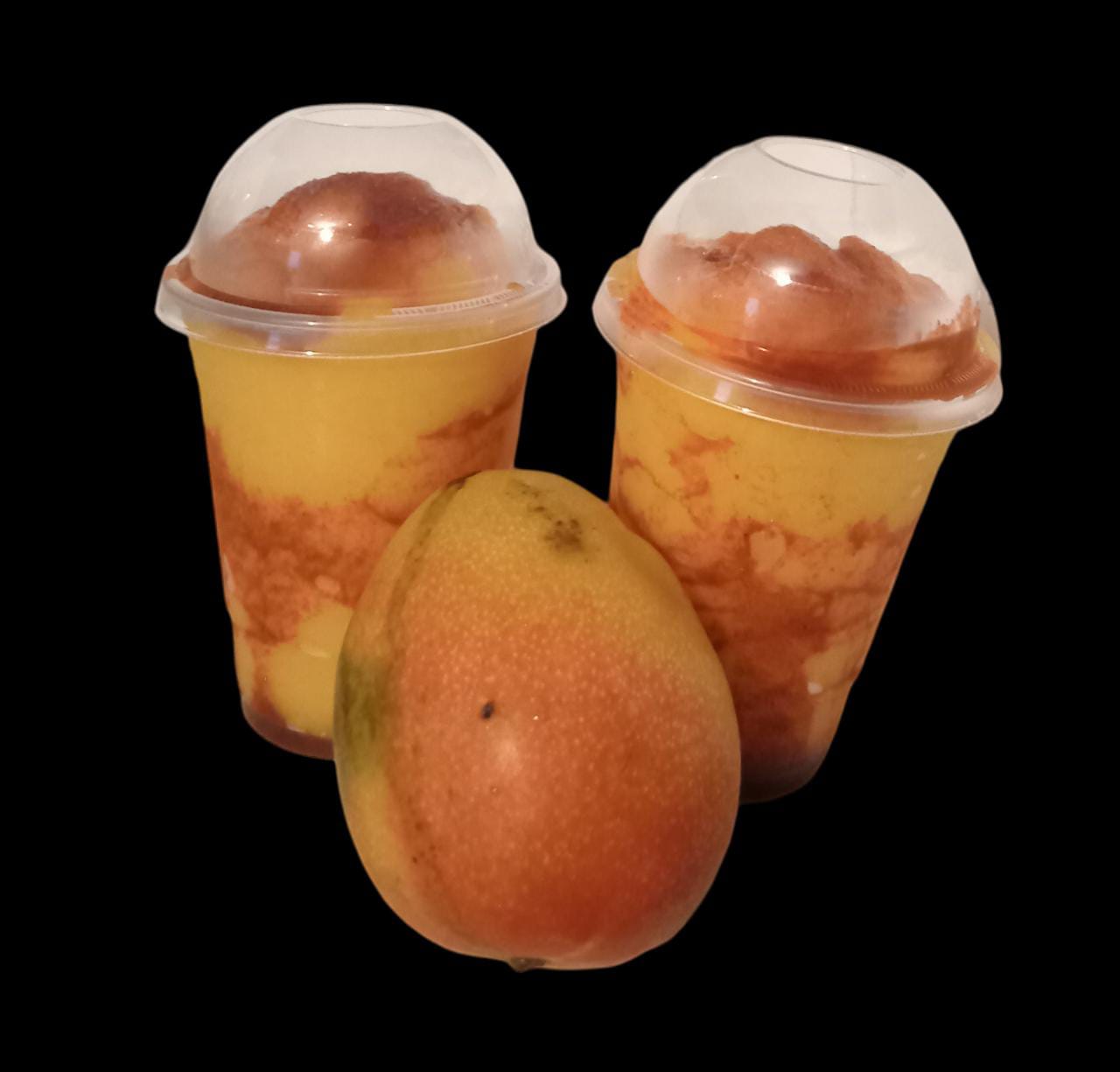 Delicioso frappé de mango natural a base de agua, acompañado de chamoy liquido y en polvo