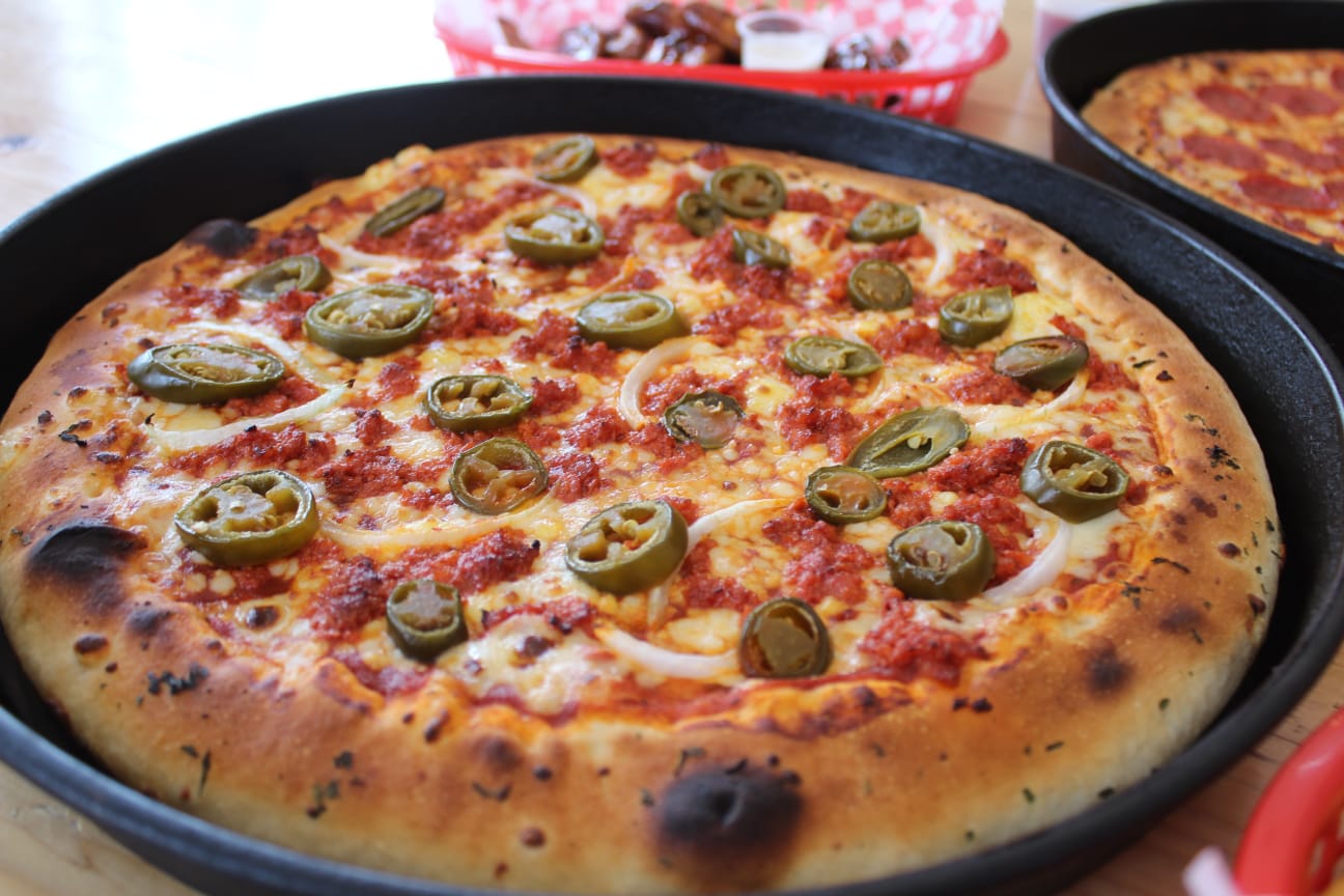Deliciosa pizza de chorizo, jalapeño y cebolla, además de un exquisito queso mozzarella.
