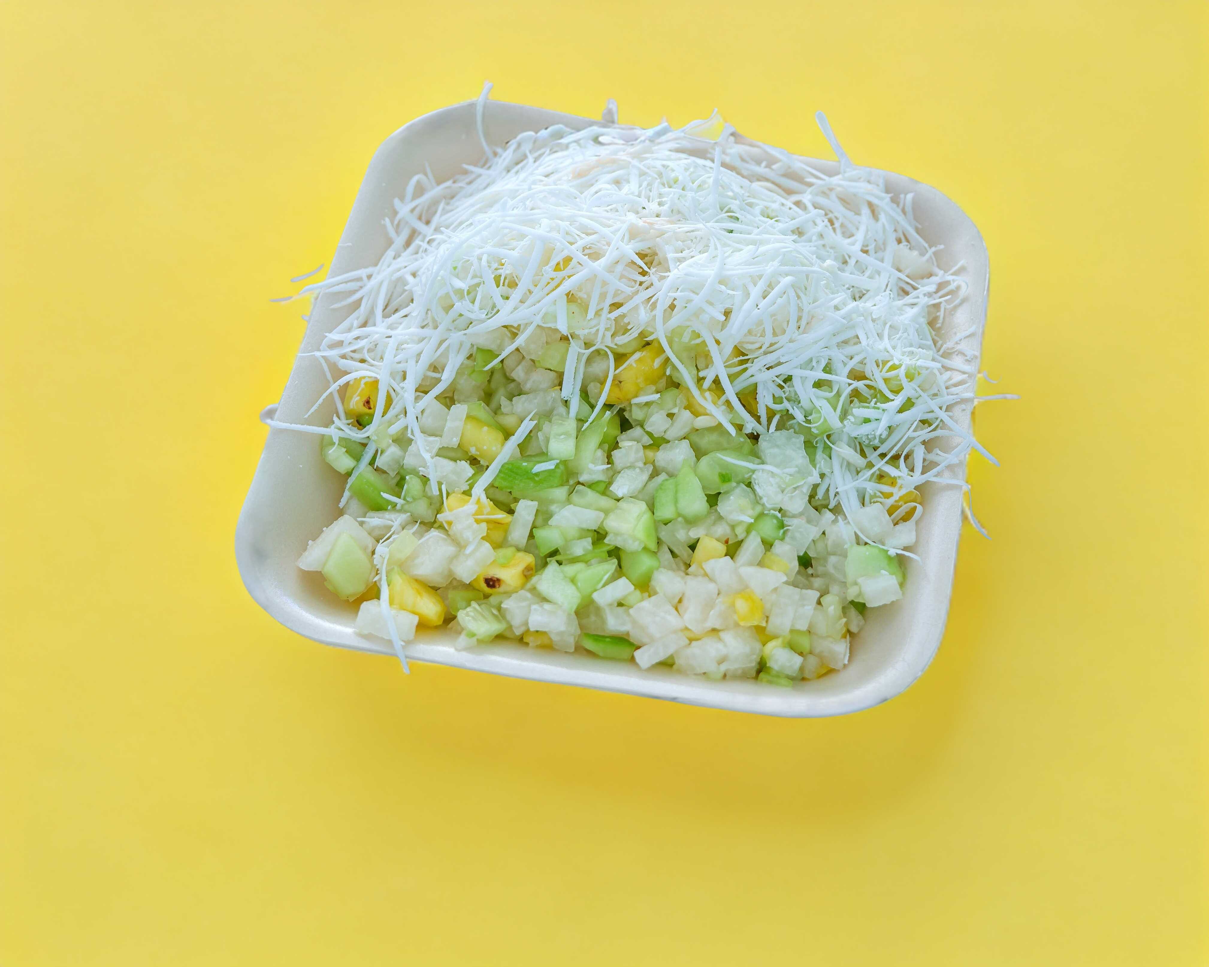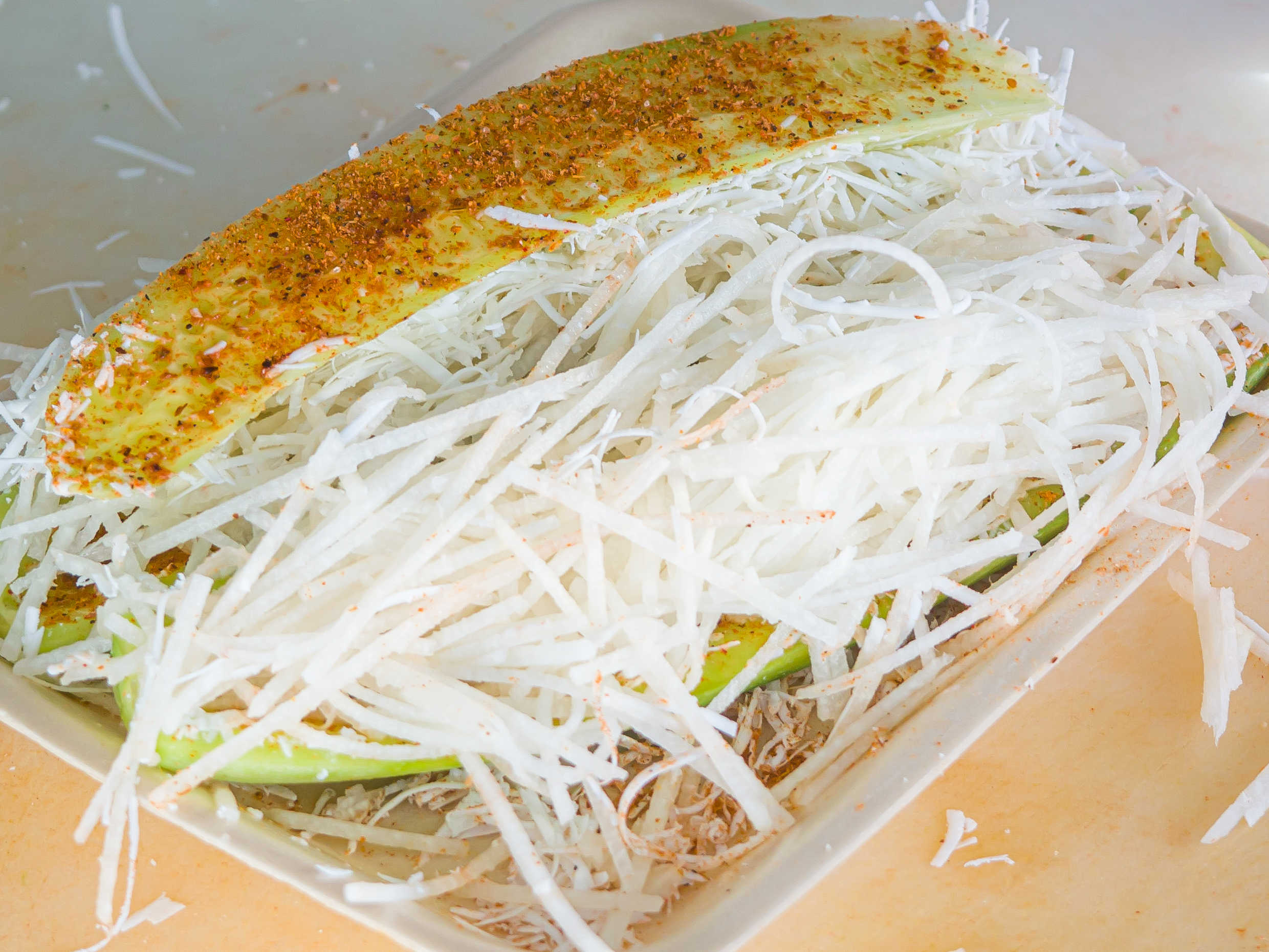 Trozos de jícama gruesa con espagueti de pepino encima