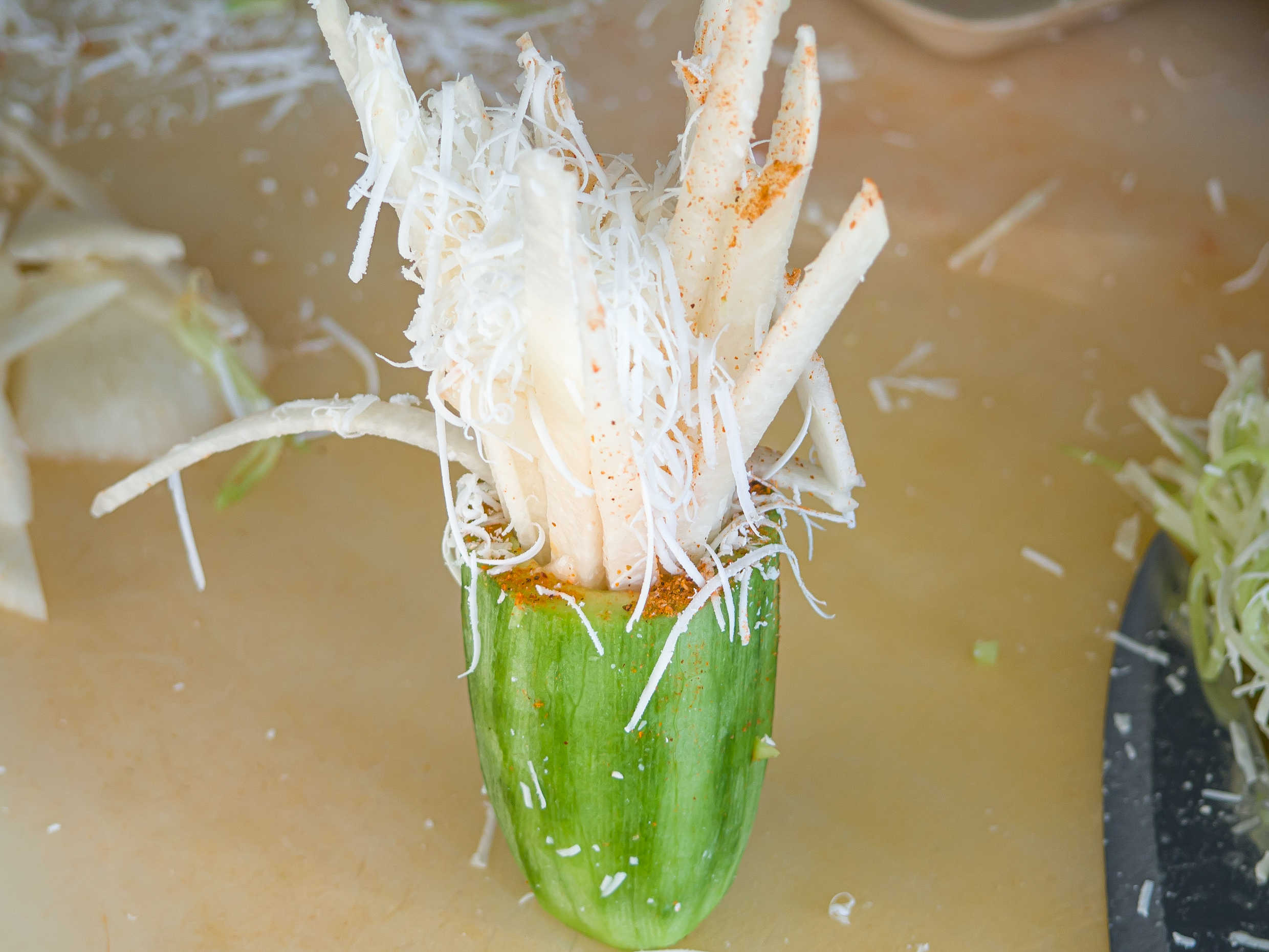 Medio pepino con tiras de jícama adentro