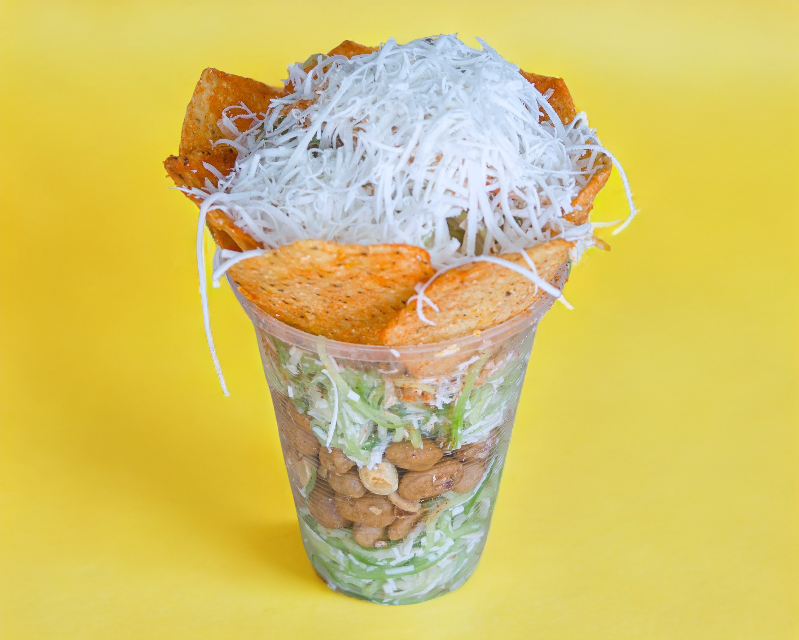 Jicama, pepino rallado, cebolla fileteada, tostachos y cacahuates