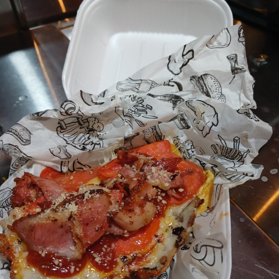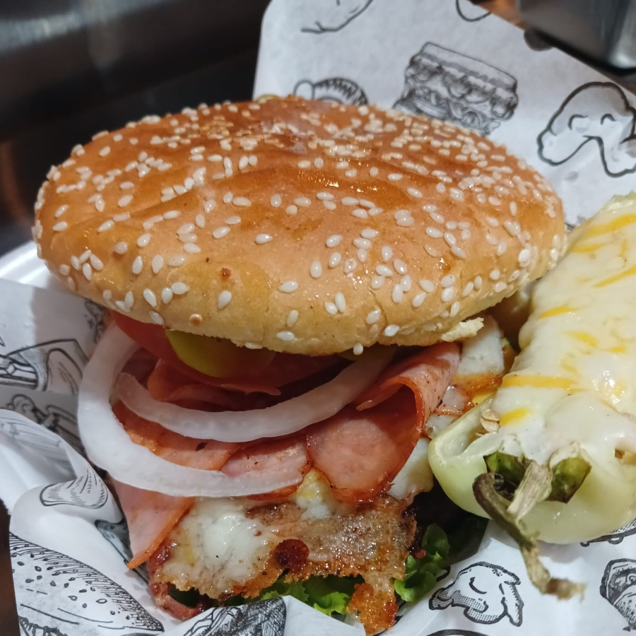 PAN JUMBO, CARNE DE RES, MEZCLA DE 4 QUESOS FUNDIDOS, QUESI TIPO AMERICANO, TOCINO, JAMON, CEBOLLA ASADA, HUEVO ESTRELLADO