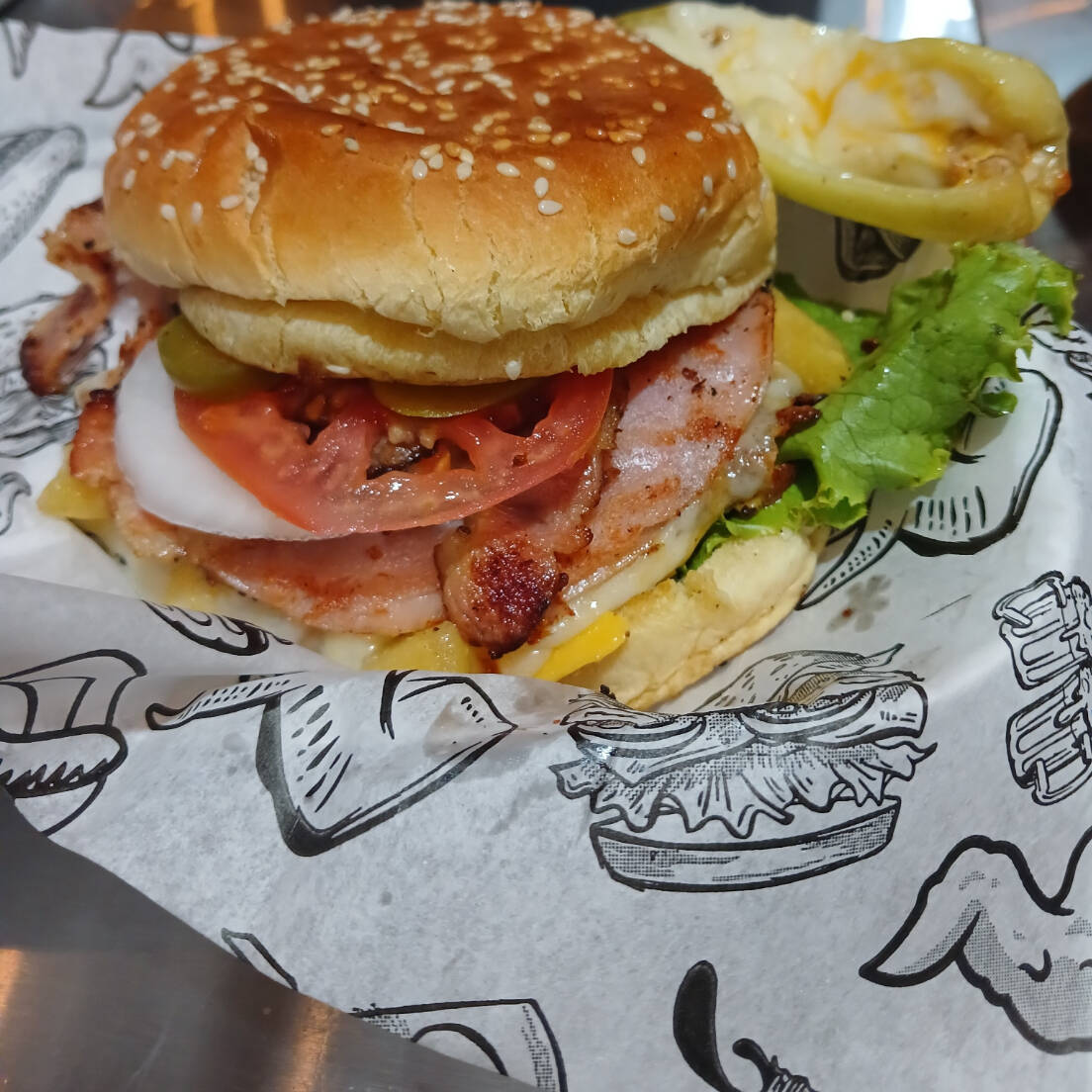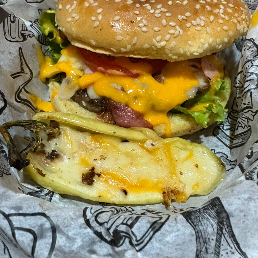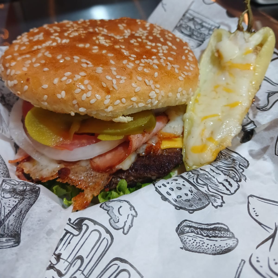PAN JUMBO, CARNE DE RES, MEZCLA DE 4 QUESOS FUNDIDO, QUESO TIPO AMERICANO, ARRACHERA, CEBOLLA ASADA, LECHUGA, JALAPEÑO, TOCINO Y SALSA BBQ