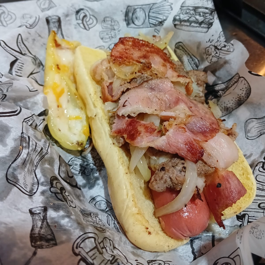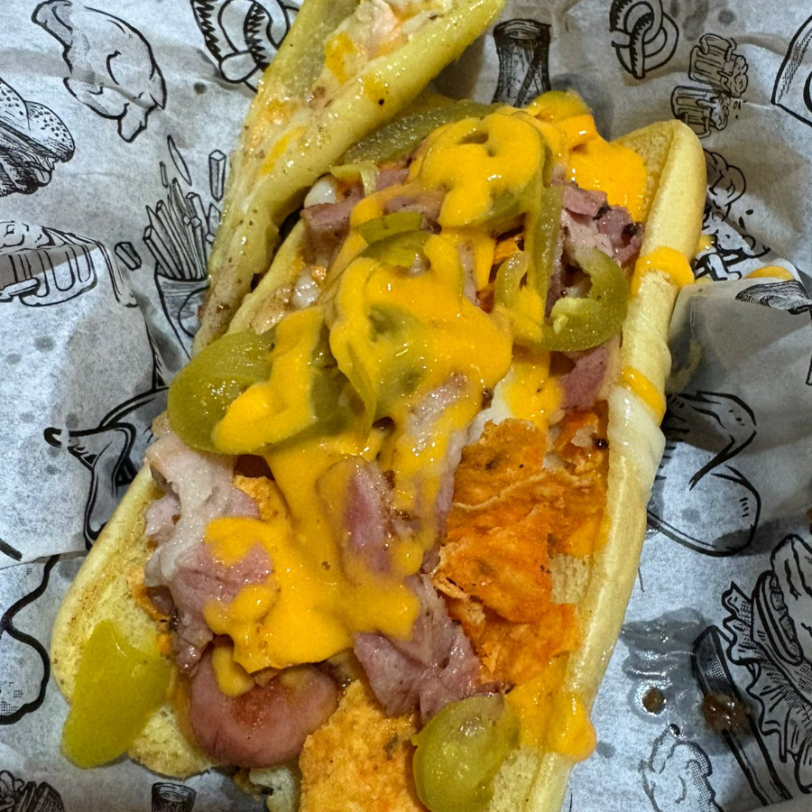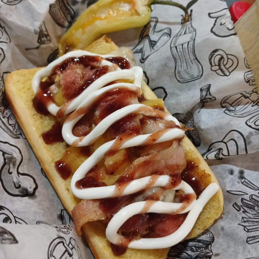 SALCHICHA JUMBO, MESCLA DE 4 QUESOS FUNDIDOS, TOCINO, ARRACHERA, QUESO PHILADELPIA, SALSA DE FRUTOS ROJOS CON HABANERO