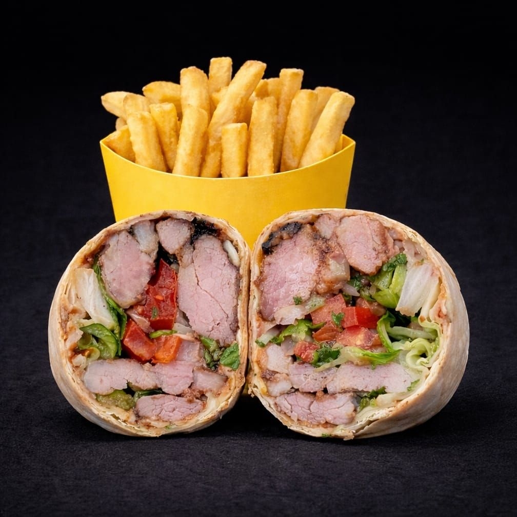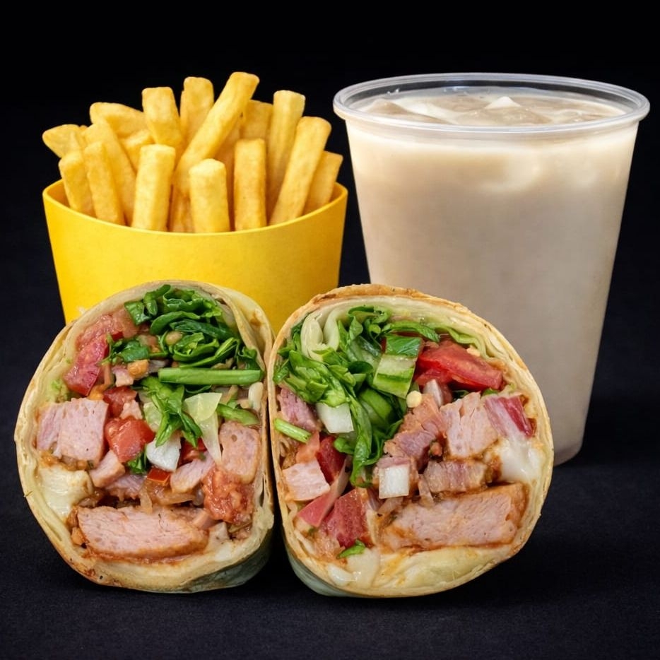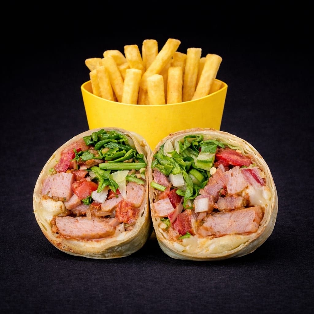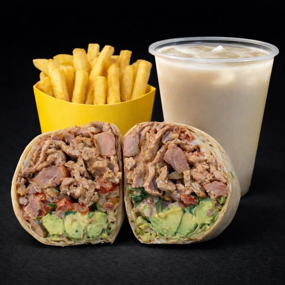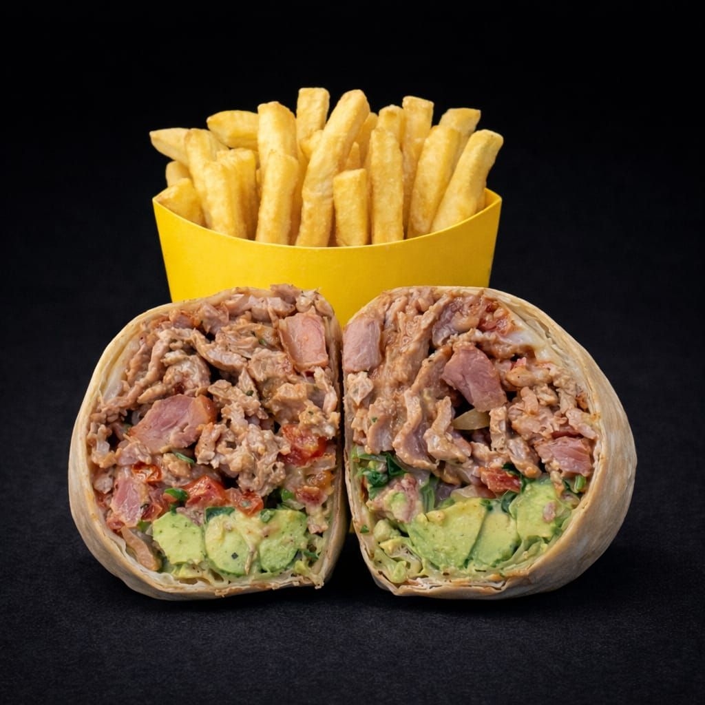 Burrito de 15 cm en tortilla de harina casera con frijoles refritos, pico de gallo, lechuga, guacamole, queso asadero, relleno de 150 gramos de chuleta ahumada. Acompañado de papas a la francesa.