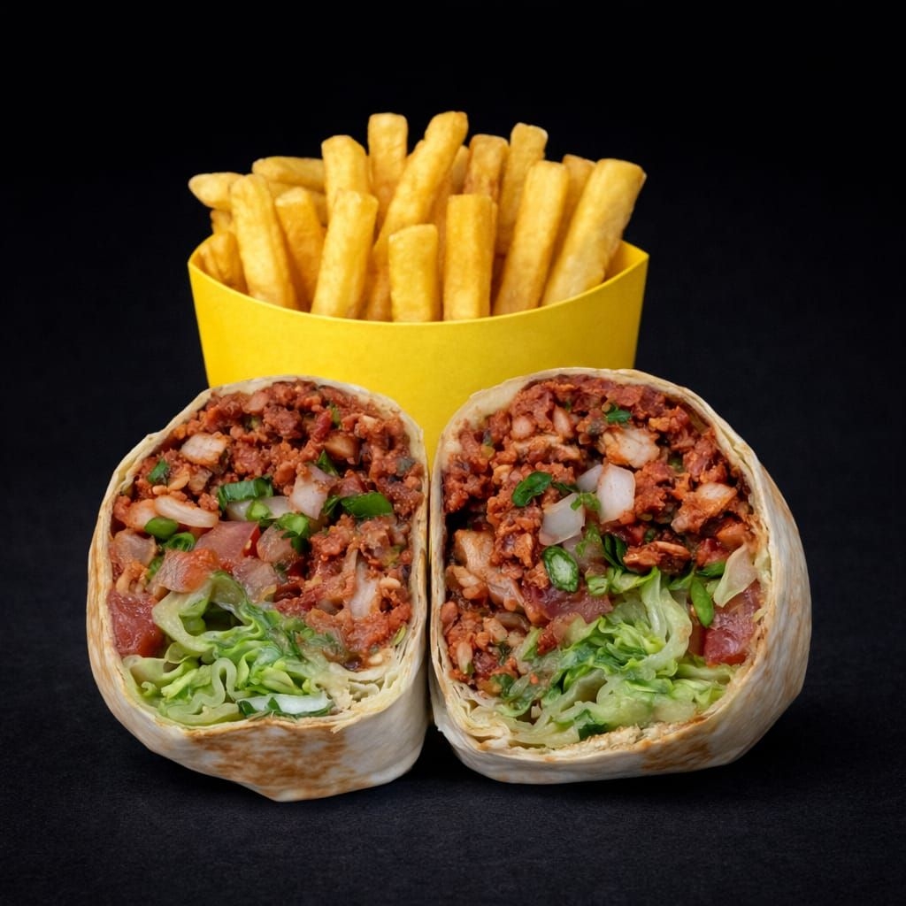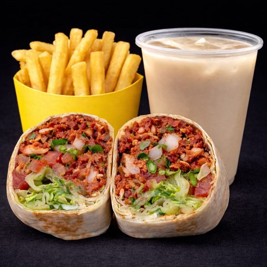 Burrito de 15 cm en tortilla de harina casera con frijoles refritos, pico de gallo, lechuga, guacamole, queso asadero, relleno de 150 gramos de mix de chorizos. Acompañado de papas a la francesa.