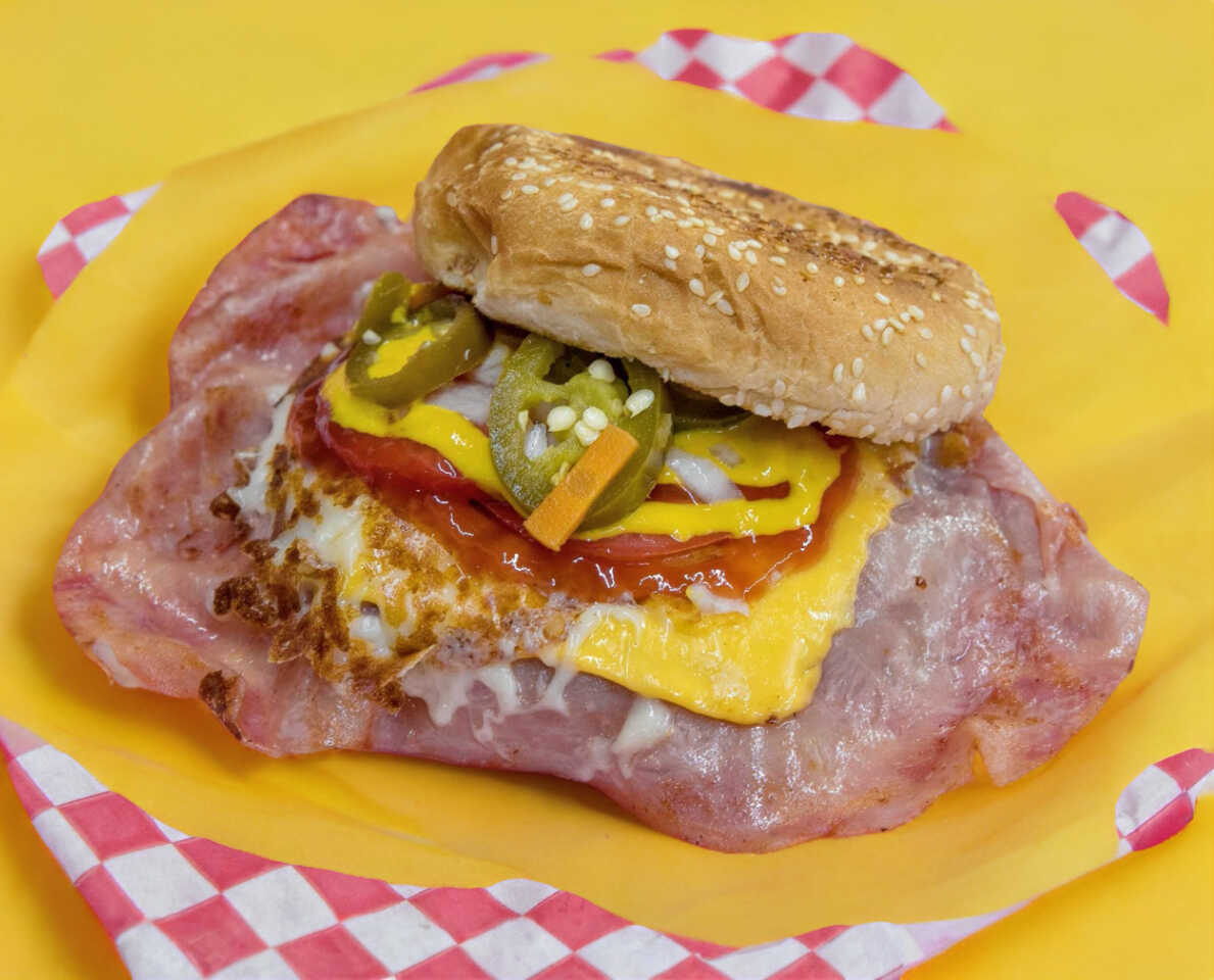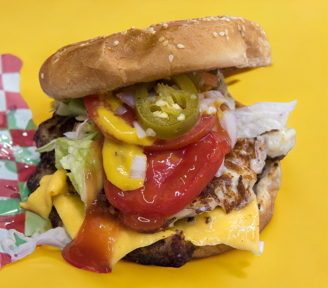 Doble carne, queso blanco, queso amarillo, jitomate, cebolla, lechuga, catsup, mostaza y chile.