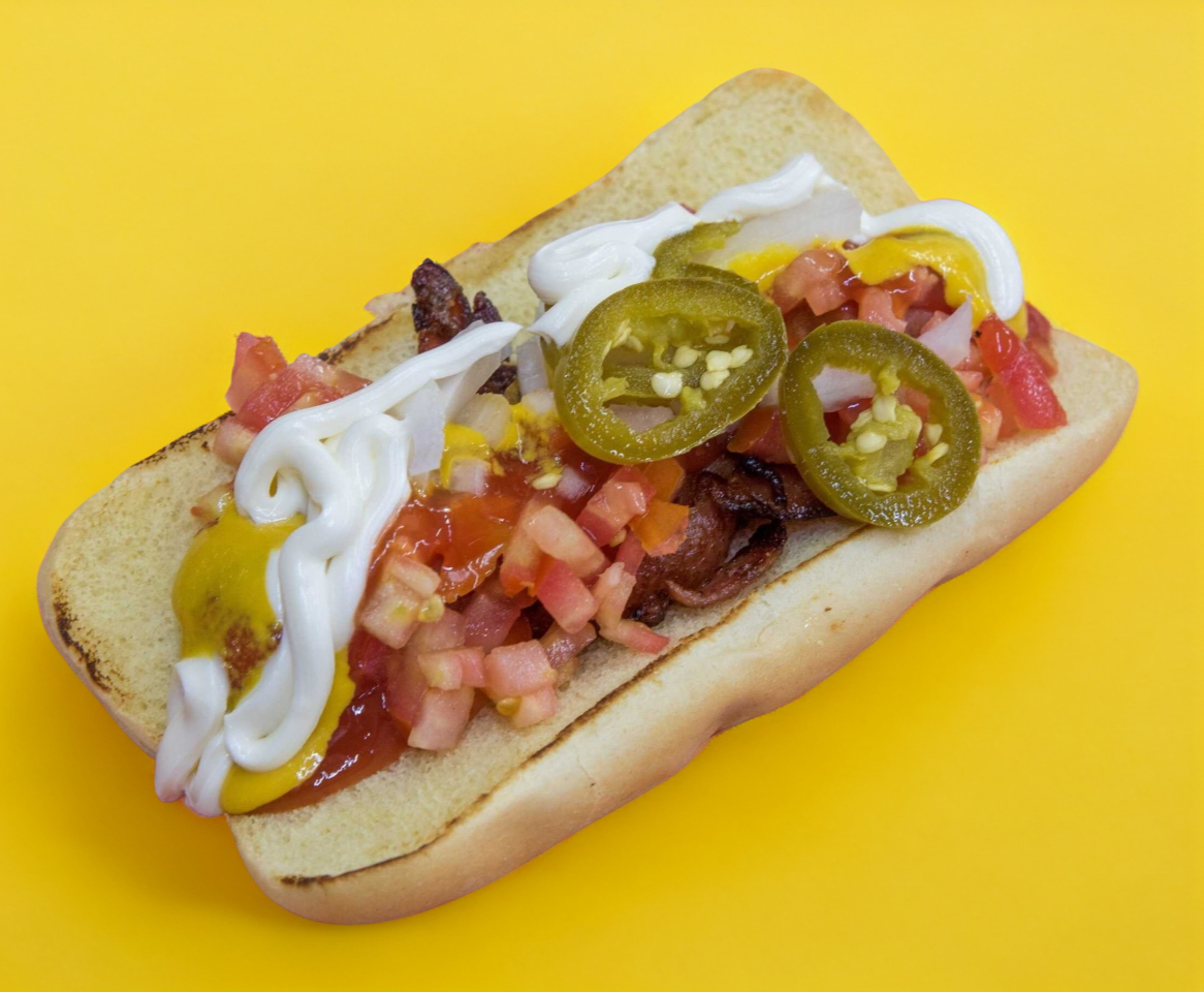 Salchicha, tocino, queso blanco, jitomate, cebolla, catsup, mostaza y chile.