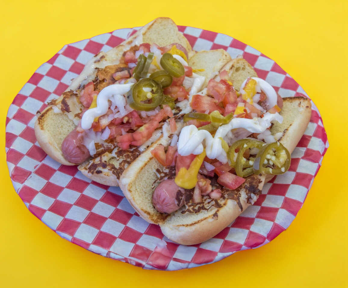 Salchicha, queso blanco, jitomate, cebolla, catsup, mostaza y chile.