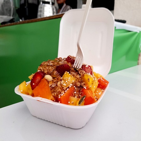 Papaya, melón, manzana, piña, y plátano; cereales: granola avena y amaranto; complemento: miel o azúcar.