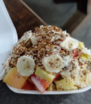 Papaya, melón, manzana, piña, plátano; cereales: gránola y amaranto.