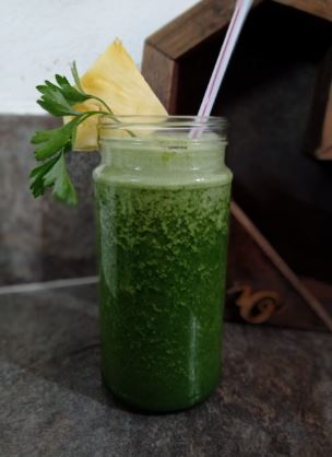 Jugo de 600ml de pepino, nopal, piña, perejil, apio y naranja.