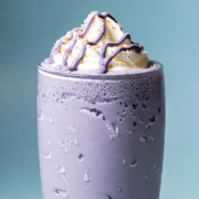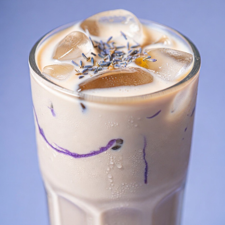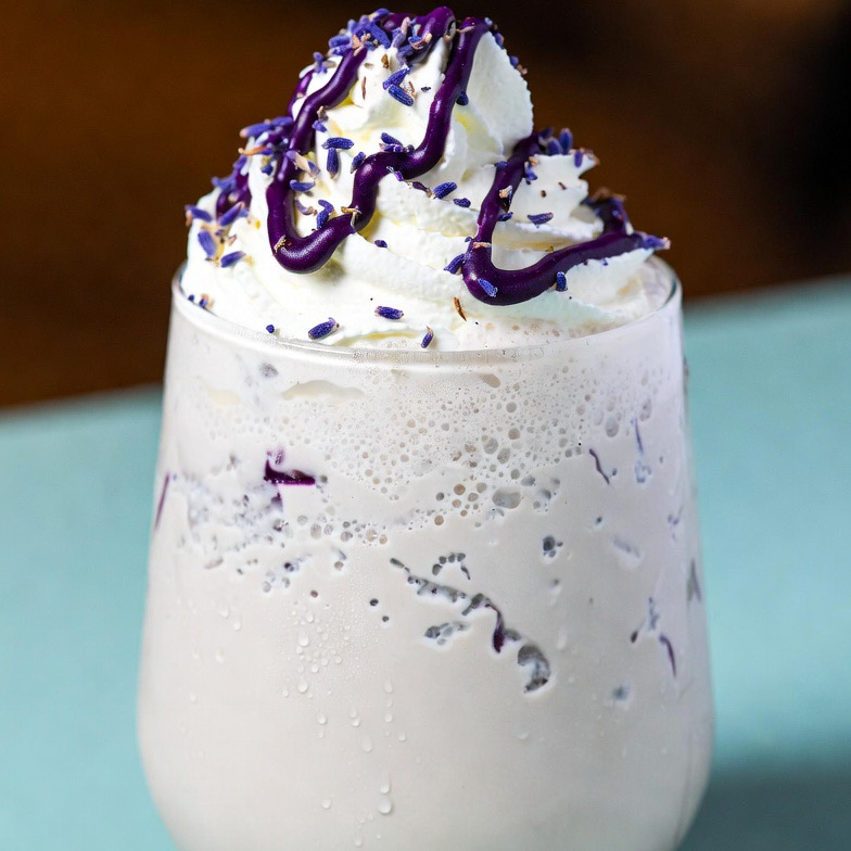 Delicioso jarabe de lavanda con chocolate blanco, hielos y lecche, decorado con crema batida y lavanda