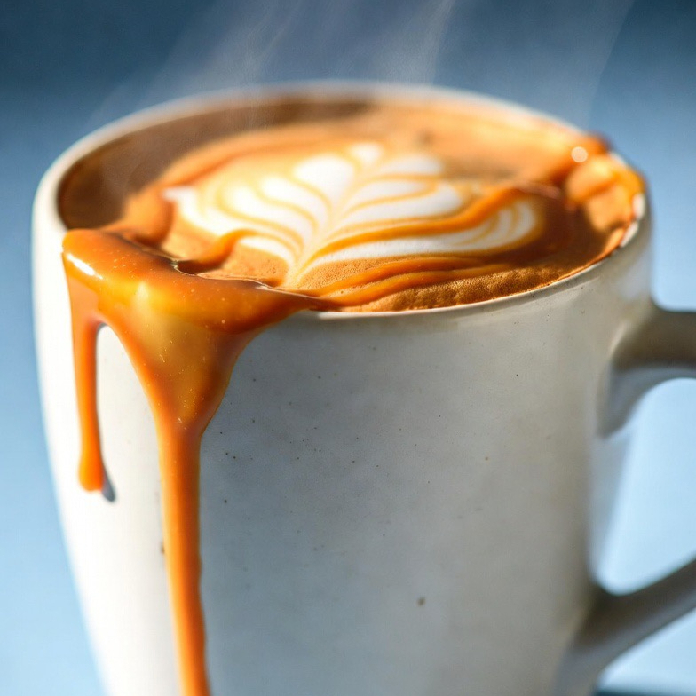 Espresso, leche vaporizada jarabe de caramelo, espuma blanca decorada con caramelo liquido.