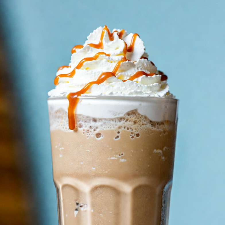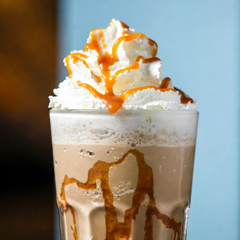 Jarabe de Caramelo, espresso, hielos y leche, decorado con crema batida y liquido de caramelo